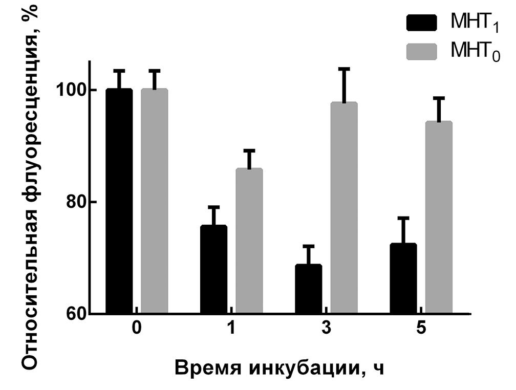 Таблица 1. Относительная флуоресценция клеток А431 и А549 (флуоресценция клеток, к которым не добавлялся МНТ, была принята за 100%) при их инкубации различные времена с 500 нМ МНТ. Указаны средние значения с соответствующей среднеквадратичной ошибкой (n = 8–17).