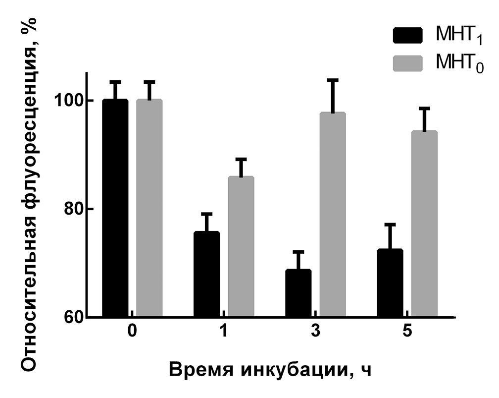 Рис. 2. Относительная флуоресценция клеток А549 (флуоресценция клеток, к которым не добавлялся МНТ была принята за 100%) при их инкубации различные времена с 500 нМ МНТ1 или 500 нМ МНТ0. Указаны средние значения с соответствующей среднеквадратичной ошибкой (n = 3–9).