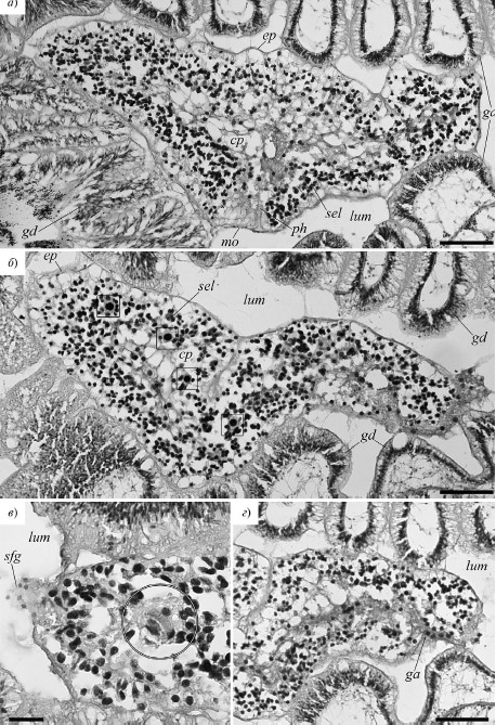 Гистологические срезы симбионтов в печеночном отделе кишечника Quatuoralisia malakhovi: (а) – продольный срез со ртом (mo) и глоткой (ph); (б) – продольный срез с гониями (показаны квадратными рамками); (в) – участок поперечного среза переднего конца с предполагаемым статоцистом (показан круговой рамкой); (г) – участок продольного среза с половым атриумом (ga). Масштаб (а, б, г) – 100 мкм, (в) – 20 мкм; cp – центральная паренхима симбионта; ep – покровный эпителий симбионта; ga – половой атриум; gd – гастродермис хозяина; lum – просвет кишечника хозяина; mo – рот; ph – глотка; sel – субэпидермальный слой симбионта; sfg – секрет фронтальных желез.