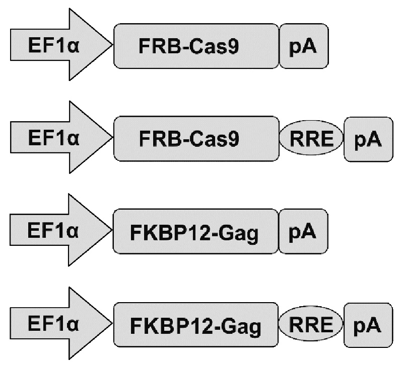 Рис. 1. Схемы плазмидных конструкций для получения VLP системы NanoMEDIC. Плазмиды pHLS-EF1α-FRB-SpCas9-A и pHLS-EF1α-FKBP12-Gag(HIV) модифицировали путем добавления элемента RRE вируса ВИЧ-1 (RRE) между кодирующей последовательностью (FRB-Cas9 или FKBP12-Gag) и сигналом полиаденилирования (pA). EF1α – промотор гена EEF1A1 человека.