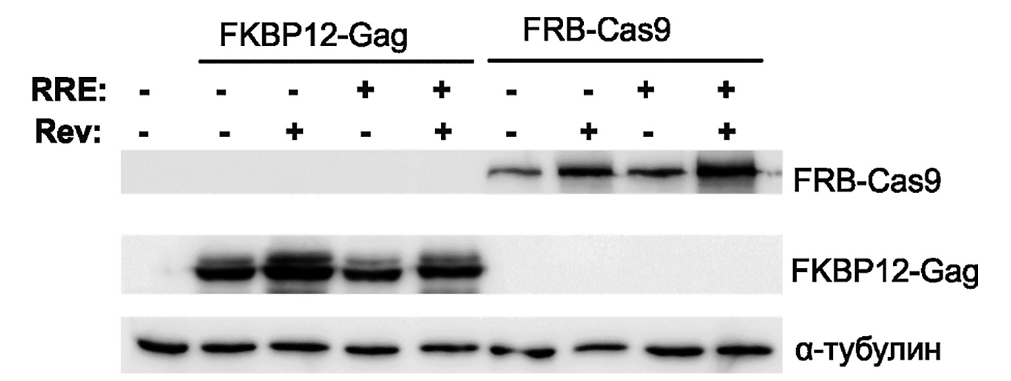 Рис. 2. Влияние экспрессии белка Rev на уровень продукции FRB-Cas9 и FKPB12-Gag. Лизаты клеток HEK293T, трансфицированных плазмидами для экспрессии FRB-Cas9 и FKPB12-Gag c элементами RRE (RRE+) или без таковых (RRE-) вместе с плазмидой для экспрессии белка Rev (Rev+) или контрольной плазмидой pBluescriptSKII(-) (Rev-), анализировали с помощью Вестерн-блоттинга с антителами к HA-эпитопу (FRB-Cas9), белку ВИЧ p27 (FKBP12-Gag) и α-тубулину для контроля суммарного уровня белка в лизатах клеток. Показаны результаты одного из двух репрезентативных экспериментов.