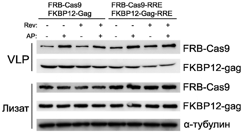 Далее проводили вестерн-блот-анализ полученных препаратов VLP и лизатов клеток-продуцентов с антителами к HA-эпитопу, белку Gag и α-тубулину. В результате было установлено, что обработка клеток веществом AP21967, вызывающим димеризацию FRB и FKBP12, приводит к примерно 2-3-кратному повышению уровня упаковки Cas9 в VLP, что было описано ранее для системы NanoMEDIC [5] (рис. 4, образцы AP+). При этом уровень упаковки Cas9 в VLP в образцах без добавления AP21967 был примерно в два раза выше для RRE-транскриптов, но не зависел от присутствия Rev. В образцах, обработанных AP21967, уровень Cas9 существенно не различался между образцами с RRE и без такового. Анализ клеточного лизата выявил повышение уровня белка Cas9 примерно в два раза во всех образцах, трансфицированных плазмидами с RRE элементом, не зависящее от присутствия Rev (см. рис. 4, панель лизаты, FRB-Cas9). По всей видимости повышенный уровень упаковки Cas9 в VLP в клетках, трансфицированных RRE плазмидами и не обработанных AP21967, обусловлен повышением уровня Cas9 в лизатах. Кроме того, при получении VLP для трансфекции используется смесь из четырех плазмид, поэтому возможное влияние плазмиды pRSV-Rev на уровень белка FRB-Cas9 в данных условиях может быть менее выражено по сравнению с экспериментами с котрансфекцией двух плазмид.