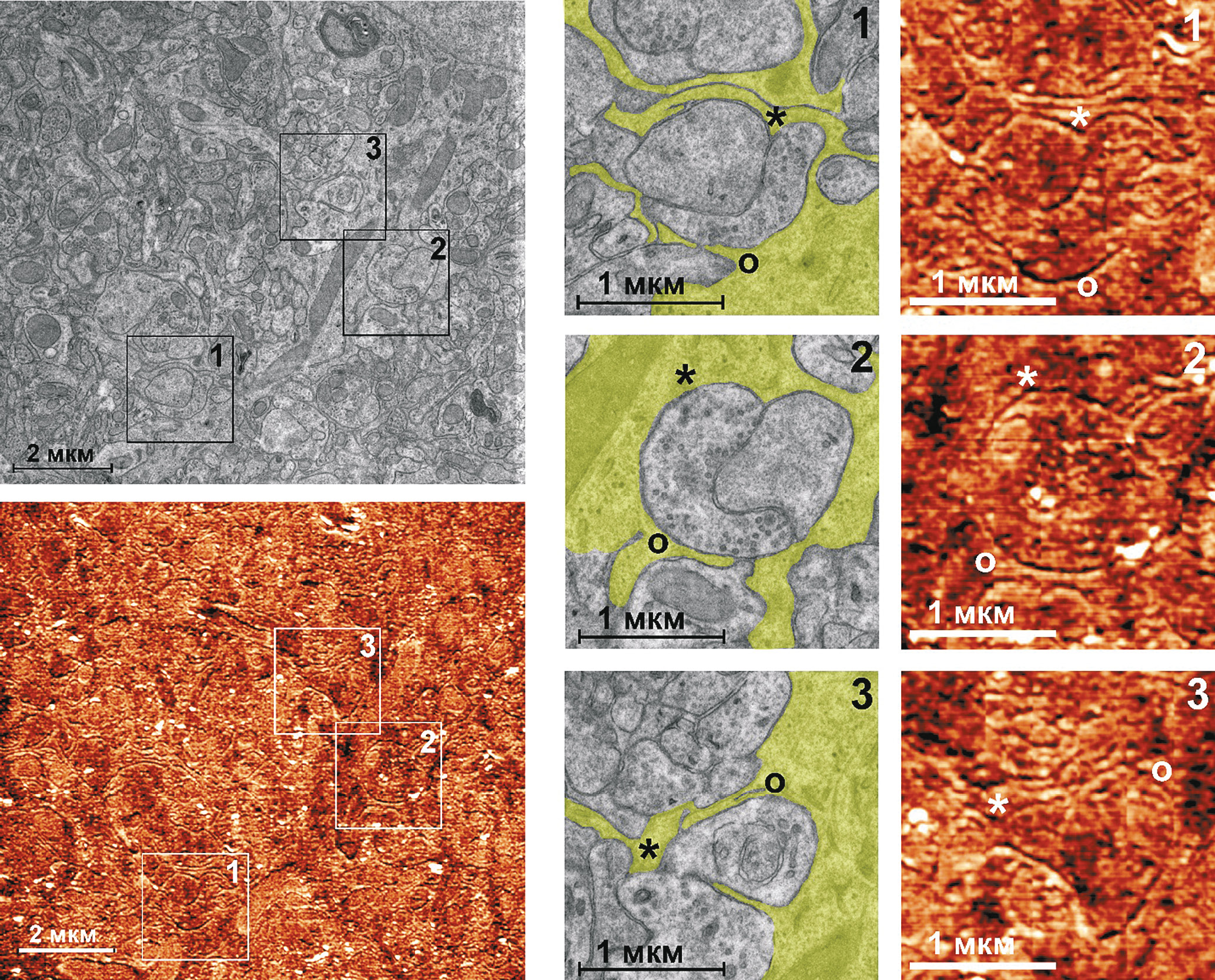 Поскольку при использовании СЗМ разрешение изображений ограничено количеством точек, в которых проводятся измерения, для выделения тонких астроцитарных структур были получены СЗМ-изображения меньшего размера с существенно более высоким латеральным разрешением. На рисунке приведены комплементарные ПЭМ- и СЗМ-изображения участков астроцитов. На ПЭМ-изображениях желтыми контурами отмечены участки, которые мы идентифицируем как астроциты. Соответствующие структуры на СЗМ-изображениях отмечены стрелками. Видно, что применение электронной микроскопии позволяет получить изображения более высокого качества. Однако СЗМ-изображения имеют достаточную детализацию для определения характерных деталей нервной ткани. Анализ приведенных данных позволяет заключить, что наиболее уверенно на СЗМ-изображениях можно регистрировать тонкие отростки астроцитов (веточки, листочки) толщиной 50–100 нм в окрестностях синапсов и щелевых контактов, которые выглядят как окружающие их удлиненные двух- или трехслойные структуры. Изучение подобных астроцитарно-нейронных взаимодействий является важной задачей, поскольку подвергается изменениям при ряде патологий. Приведенные изображения были получены для выполненного сверхтонкого среза при помощи ПЭМ и поверхности блока после среза при помощи СЗМ. Однако, несмотря на максимально приближенные к комплементарности объекты, коррелятивная морфология наблюдаемых структур не полностью совпадает, что говорит о том, что морфология астроцитарных участков может заметно изменяться на масштабе нескольких толщин среза, которая составляет всего несколько десятков нанометров.