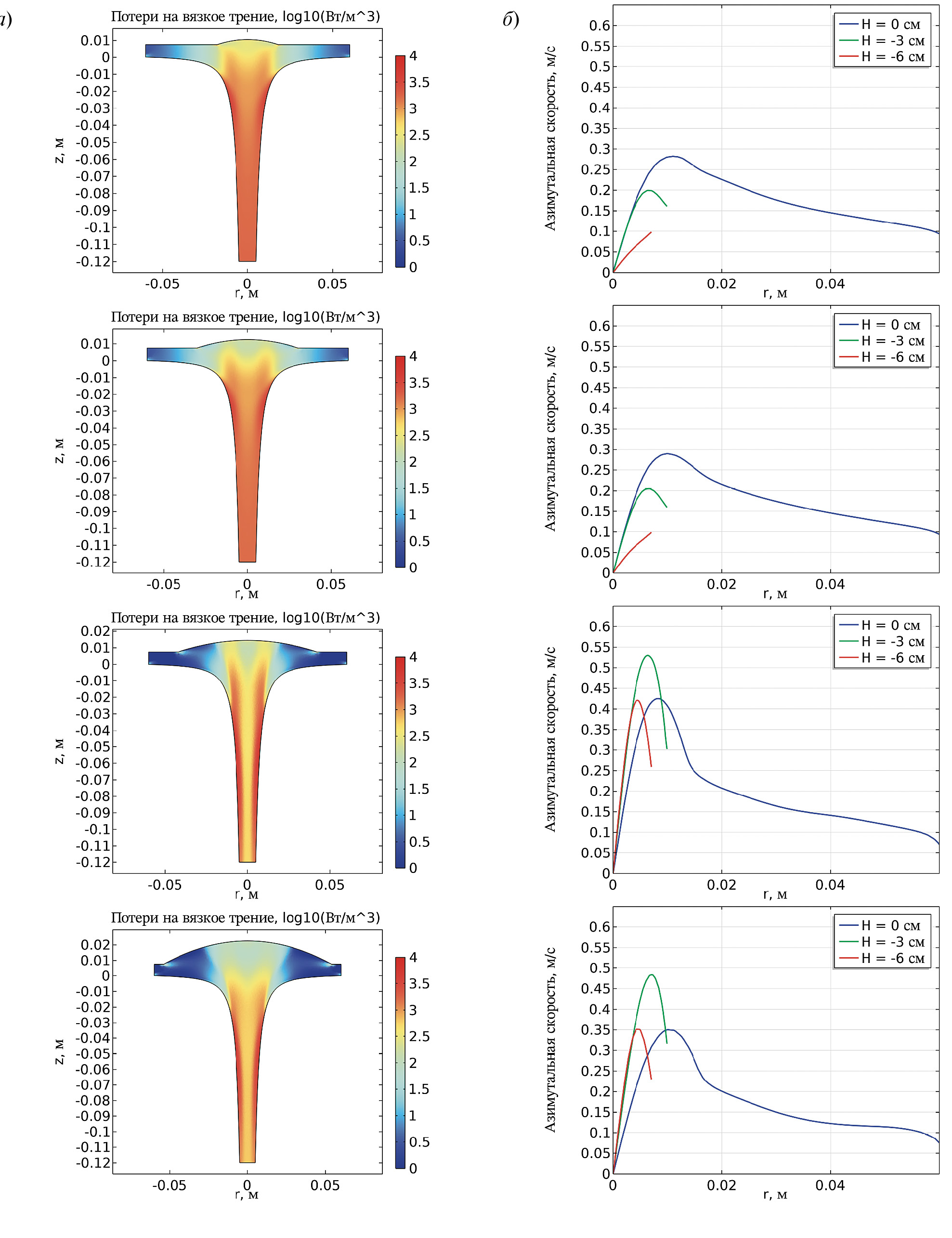 Рис. 12. Распределение потерь на вязкое трение (а) и структура азимутальных скоростей (б) при различных размерах вогнутой поверхности. Видно, что с увеличением добавочного объема, создаваемого вогнутой поверхностью, течение становится вихревым с расширением области формирования вихря, что способствует снижению потерь в этой зоне.