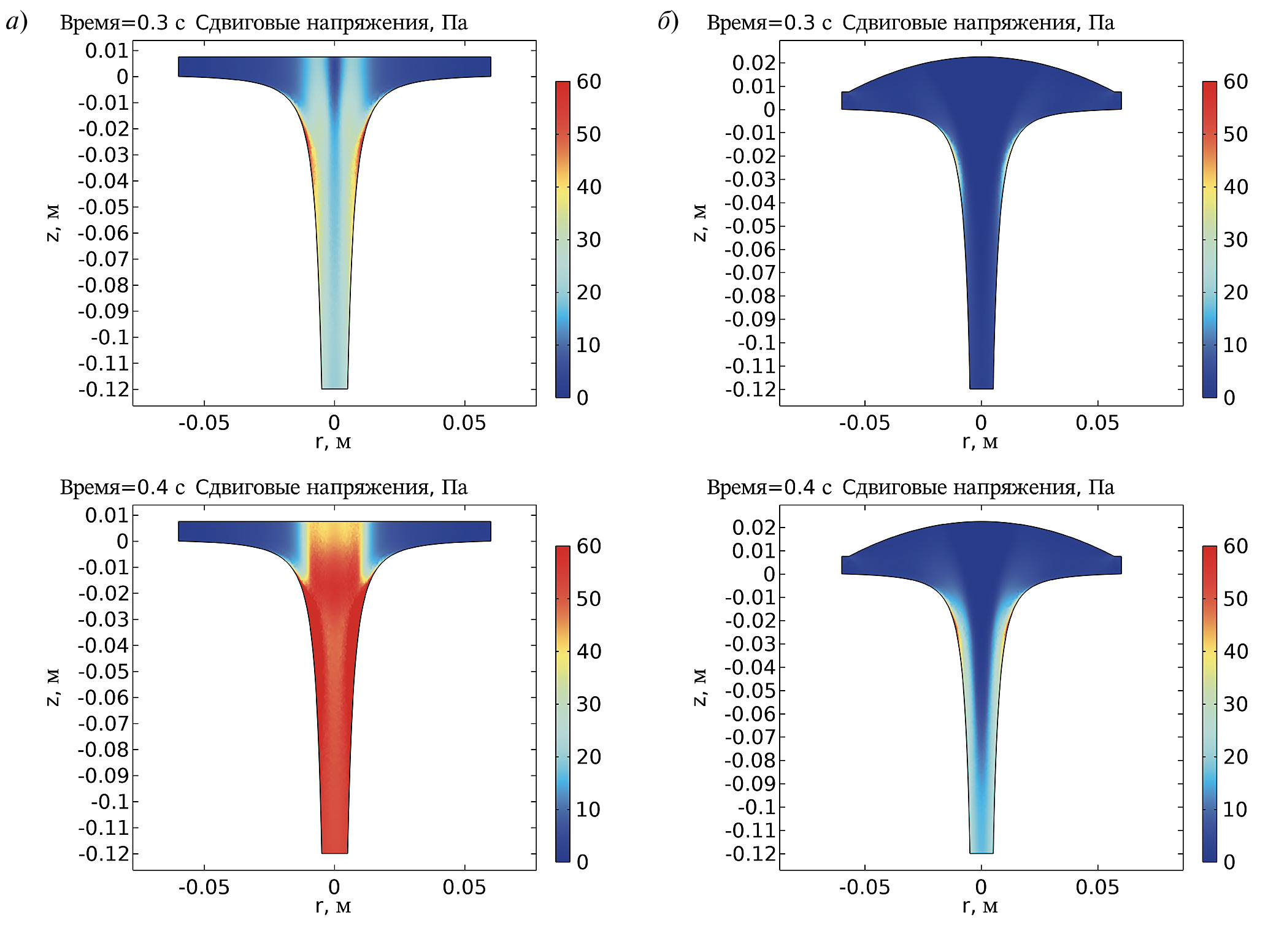 Было получено, что наличие поверхности в основании канала в динамическом режиме снижает максимальное сдвиговое напряжение в потоке вдвое (рис. 15, 16). Из представленной структуры модельного течения видно, что областью максимальных сдвиговых напряжений в канале является стенка в области сужения. В случае отсутствия поверхности повышенные сдвиговые напряжения также локализуются в области формирования струи, что является следствием более высоких значений азимутальной скорости в этой зоне. Очевидно, что уровень сдвиговых напряжений в канале при наличии вогнутой поверхности значительно снижен.