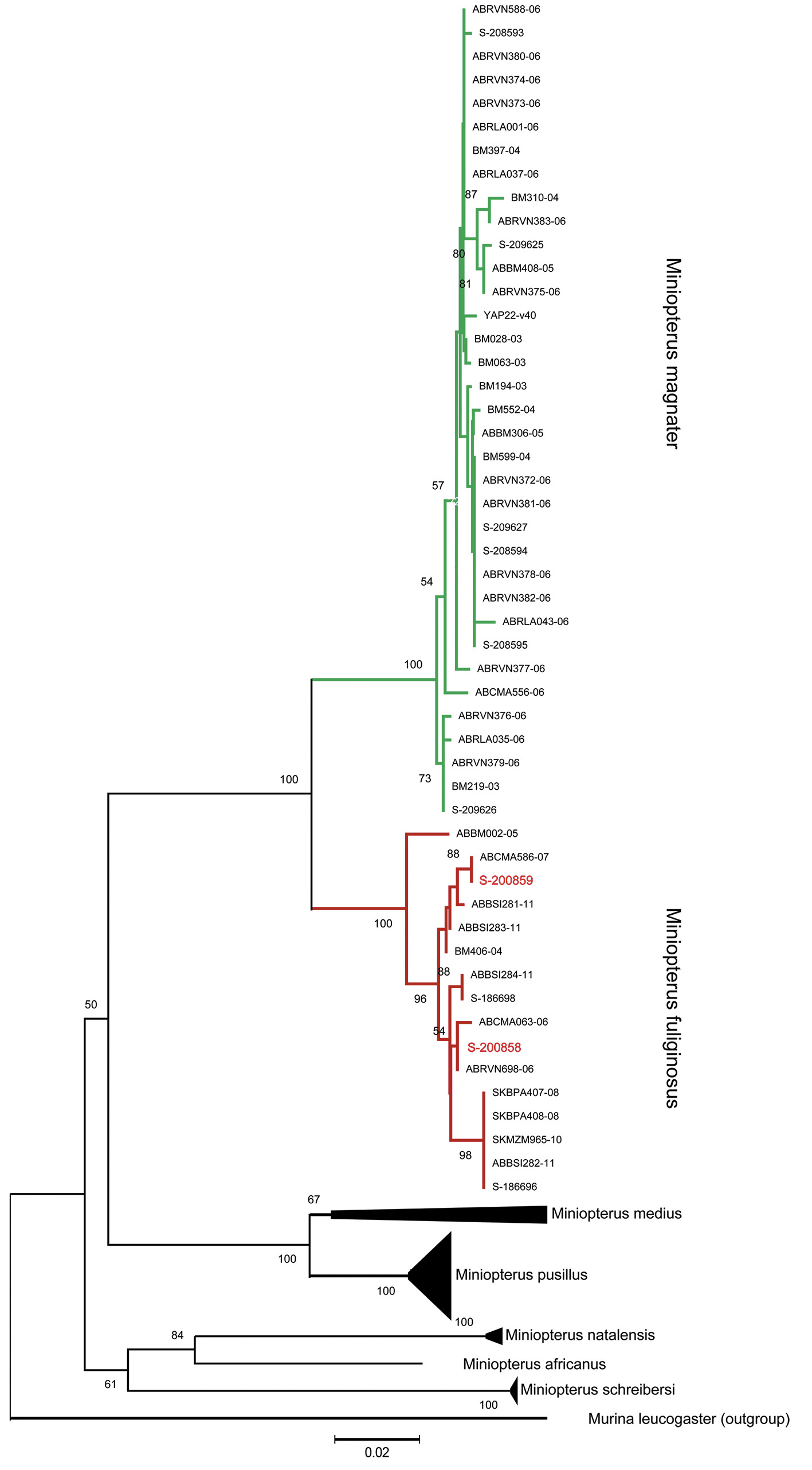 Рис. 2. Филогенетические взаимоотношения представителей рода Miniopterus по данным конкатената двух митохондриальных генов (COI и cytb). В анализ включены только оригинальные сиквенсы, кроме M. schreibersii из Италии, взятого в качестве внешней группы. Экземпляры из провинции Каобанг отмечены красным.