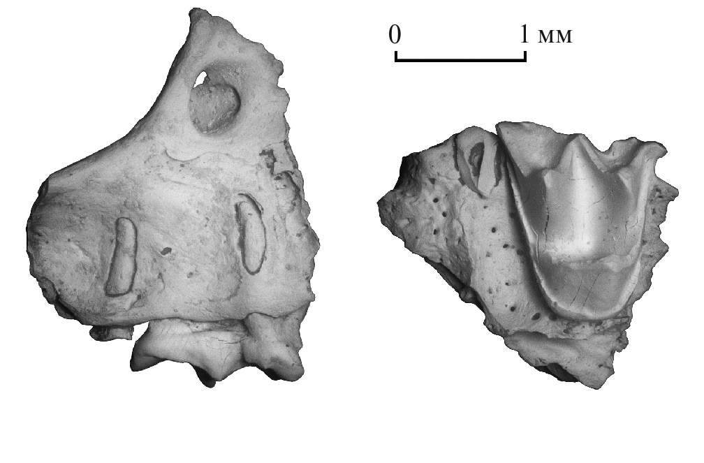 Рис. 1. Plecotus macrobullaris sarmaticus Lopatin subsp. nov., экз. ПИН, № 5644/651, фрагмент правой верхнечелюстной кости с M1 (СЭМ): а – с лабиальной стороны, б – с окклюзиальной стороны; Россия, Крым, пещера Таврида; нижний плейстоцен.