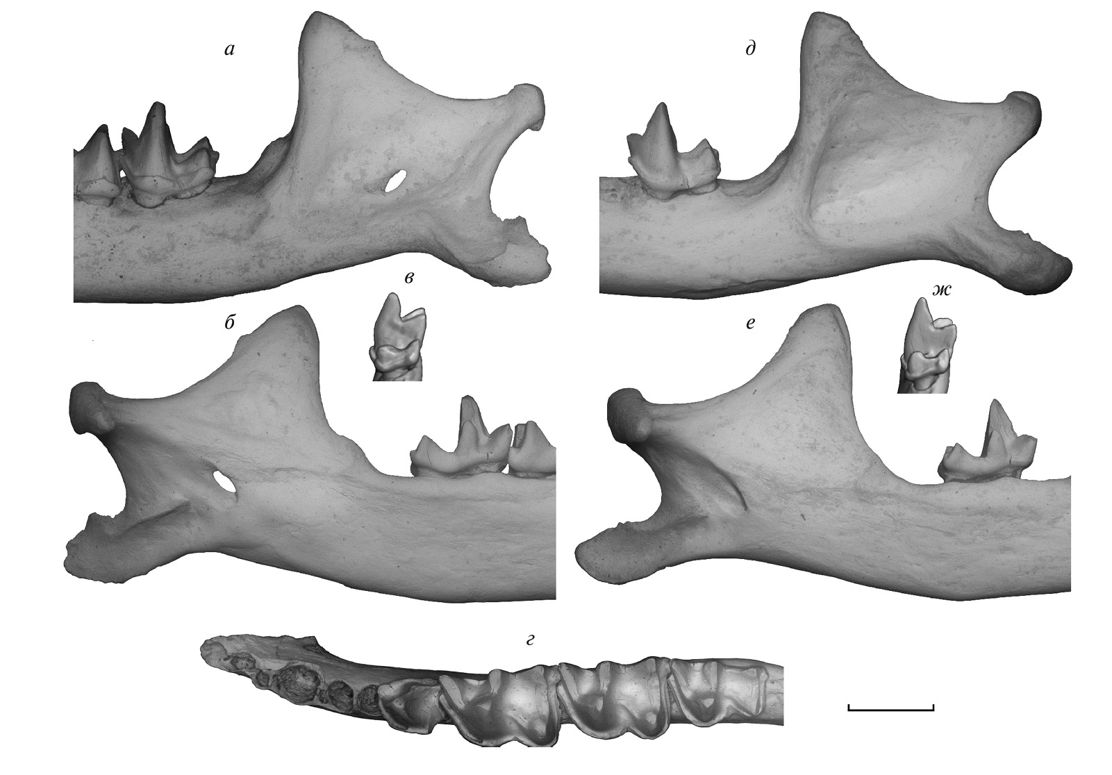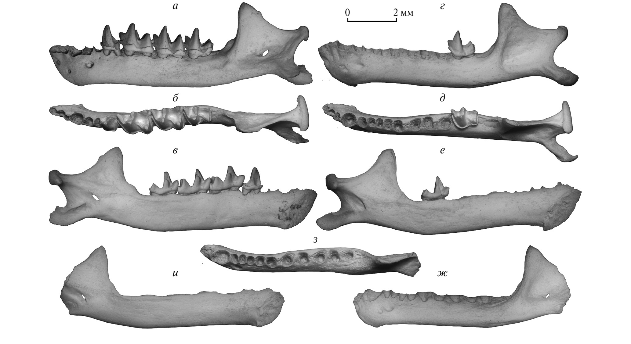 Рис. 3. Plecotus macrobullaris sarmaticus, Lopatin, subsp. nov.: а–г – голотип ПИН, № 5644/652, левая нижнечелюстная кость с P4–M3: а – восходящая ветвь с лабиальной стороны, б – восходящая ветвь с лингвальной стороны, в – M3 с задней стороны, г – горизонтальная ветвь с P4–M3 с окклюзиальной стороны; д–ж – экз. ПИН, № 5644/653, левая нижнечелюстная кость с M3: д – восходящая ветвь с лабиальной стороны, е – восходящая ветвь с лингвальной стороны, ж – M3 с задней стороны (а, б, г–е – СЭМ; в, ж – компьютерные модели); Россия, Крым, пещера Таврида; нижний плейстоцен.