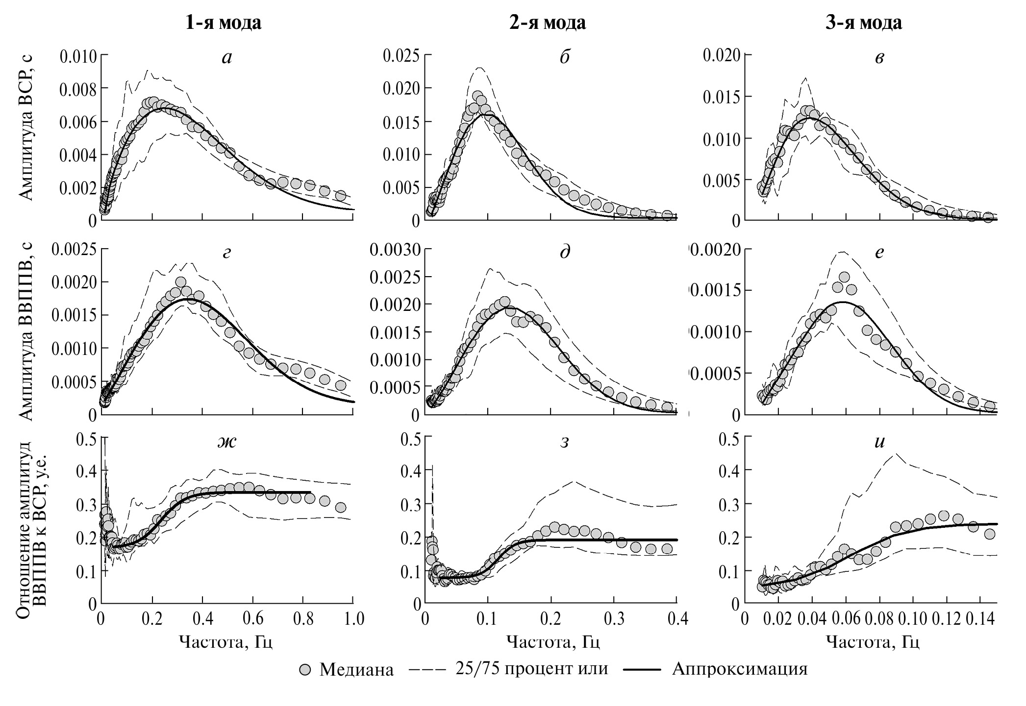 Рис. 1. Спектры эмпирических мод для ВСР (а, б, в) и ВВППВ (г, д, е) и их отношения (ж, з, и). Точки – медианы; пунктирные кривые – 25 и 75 процентили; жирные сплошные кривые – аппроксимации функциями Вейбулла (а–е) и 4-х-параметрическими сигмоидальными функциями (ж–и).