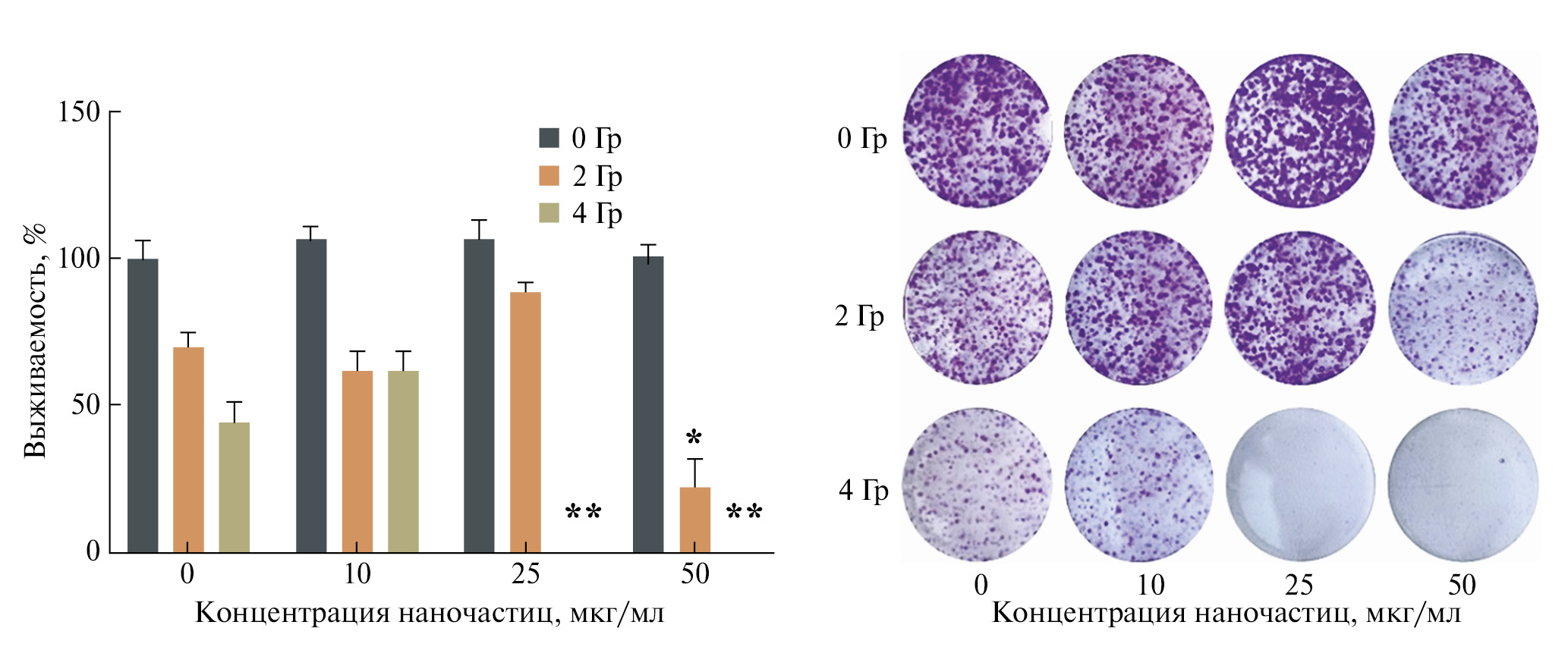 Рис. 2. Клоногенный анализ клеток аденокарциномы EMT6/P после облучения протонным пучком в присутствии наночастиц Au-PEG. * – p < 0.05, ** – p < 0.001, тест Стьюдента.
