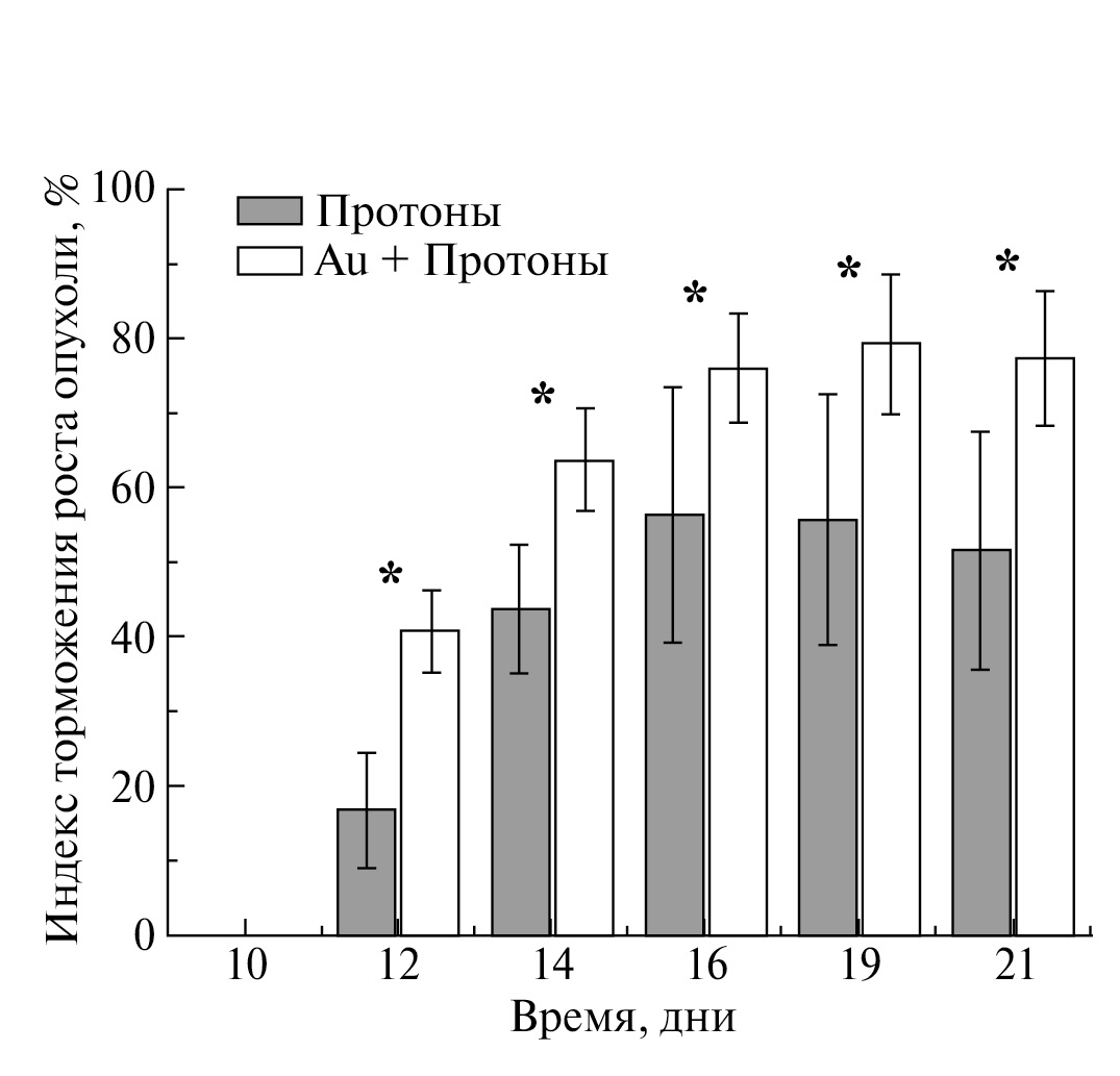 Использование наночастиц Au-PEG-FA в качестве радиосенсибилизатора при проведении протонной лучевой терапии значительно усиливало биологический ответ карциномы Эрлиха in vivo. При однократном локальном облучении протонами в дозе 31 Гр отмечалось выраженное торможение роста опухоли (ТРО = 55–60%). В то же время предварительное внутривенное введение наночастиц статистически значимо усиливало торможение роста опухоли на 15–25% на протяжении всего периода наблюдений, при этом показатель ТРО достигал 80% (рис. 3). При этом токсического (летального) действия протонной и бинарной терапии в опыте не наблюдалось.