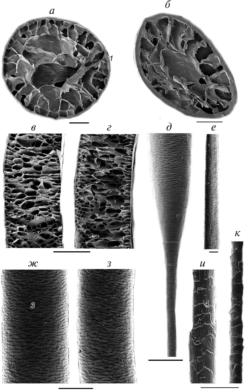 Рис. 2. Микроструктура остевого волоса спины взрослого самца Hydropotes inermis: (а)(б) – поперечное сечение изогнутого волоса соответственно в его середине и выше; (в)(г) – продольное сечение середины изогнутого волоса; (д) – тонкая “ножка” волоса с резким расширением стержня и выше; (ж)(з) – кутикула соответственно середины изогнутого волоса и выше; (е)(и)(к) – вершина волоса: 1 – кора, 2 – сердцевина, воздушные полости и перегородки, 3 – черепичная волнистая кутикула, 4 – кольцевидная кутикула. Данные СЭМ. Масштаб: a, б – 50 мкм; в, г, ж, з – 200 мкм; д, е, и, к – 20 мкм.