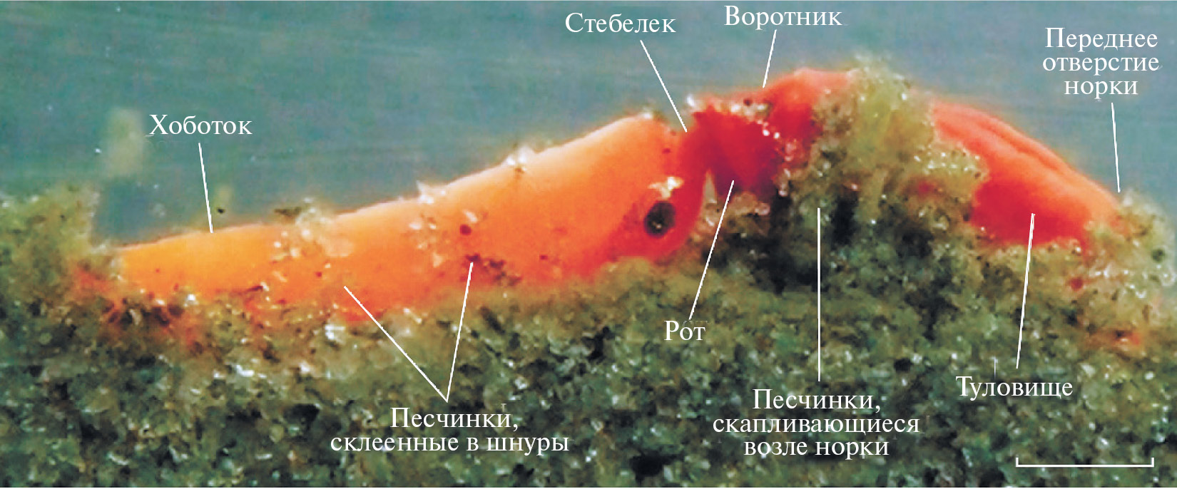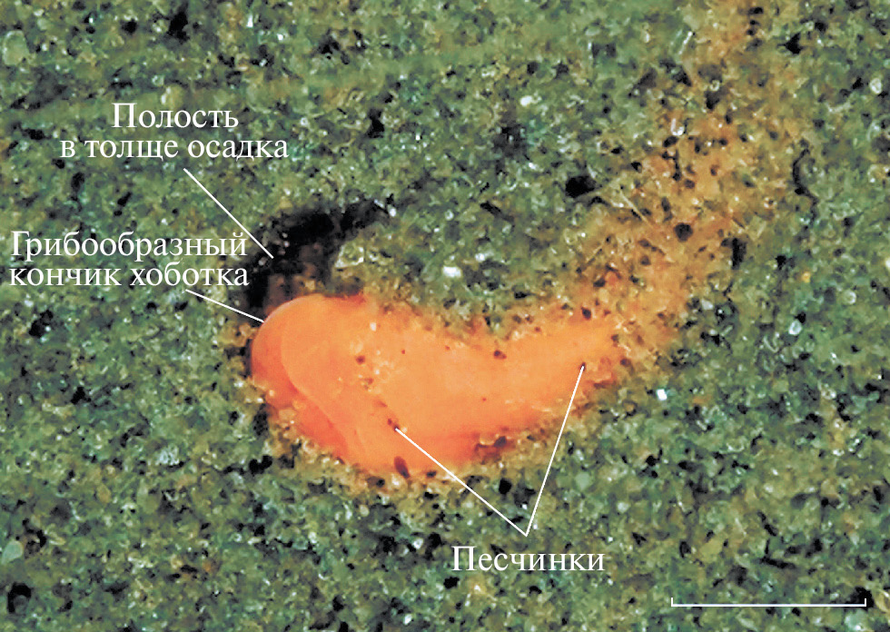 Рис. 4. Хоботок Saccoglossus mereschkowskii, простирающийся вдоль поверхности грунта для питания. Масштаб: 1 мм.