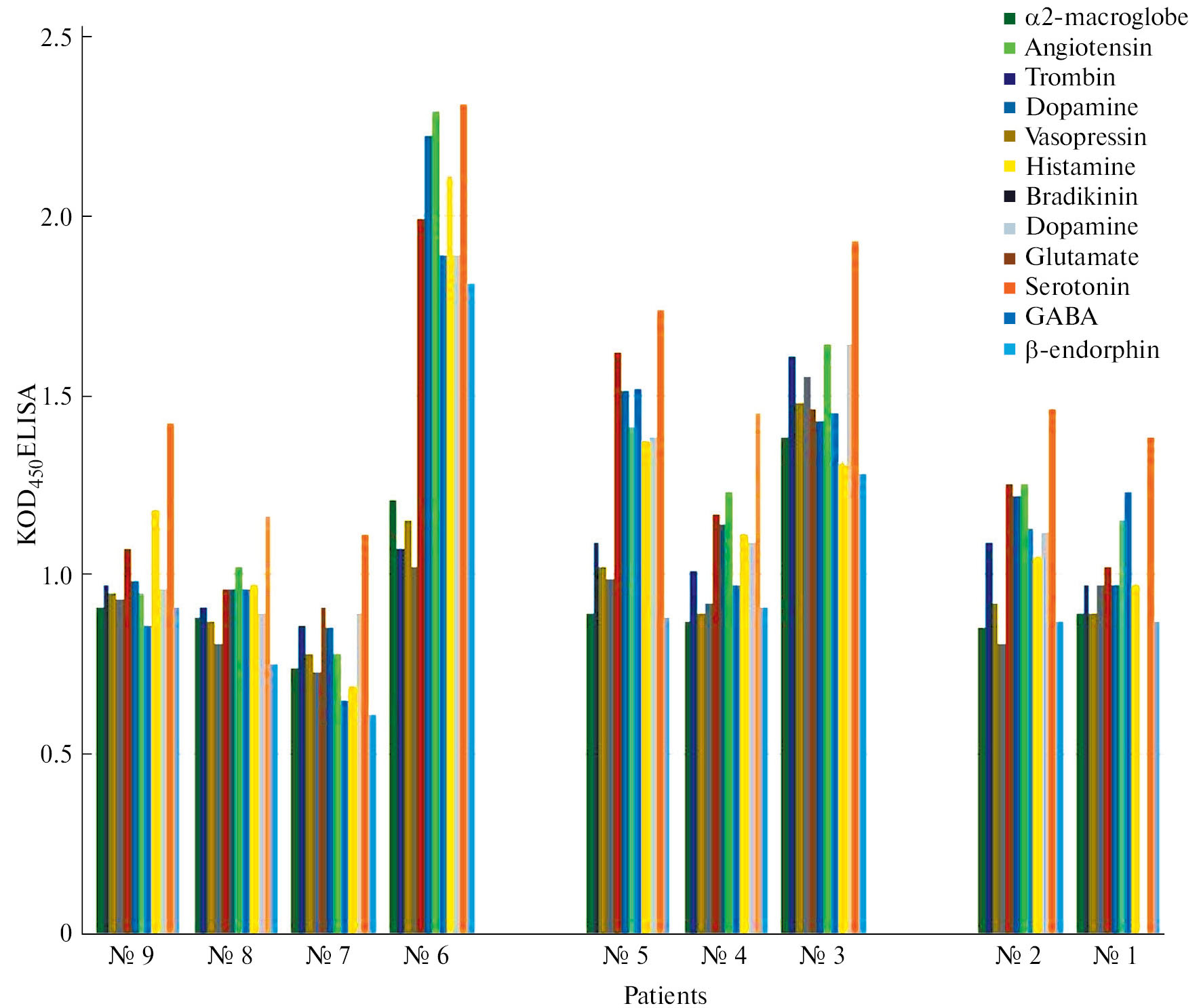 Установлено, что изменение уровней специфических антител к β-эндорфину, серотонину, дофамину, гистамину, орфанину, ангиотензину, ГАМК, глутамату, брадикинину, вазопрессину, тромбину, α-2-макроглобулину, является индивидуальным, и каждый пациент обладает характерным иммунопрофилем (рис. 1).