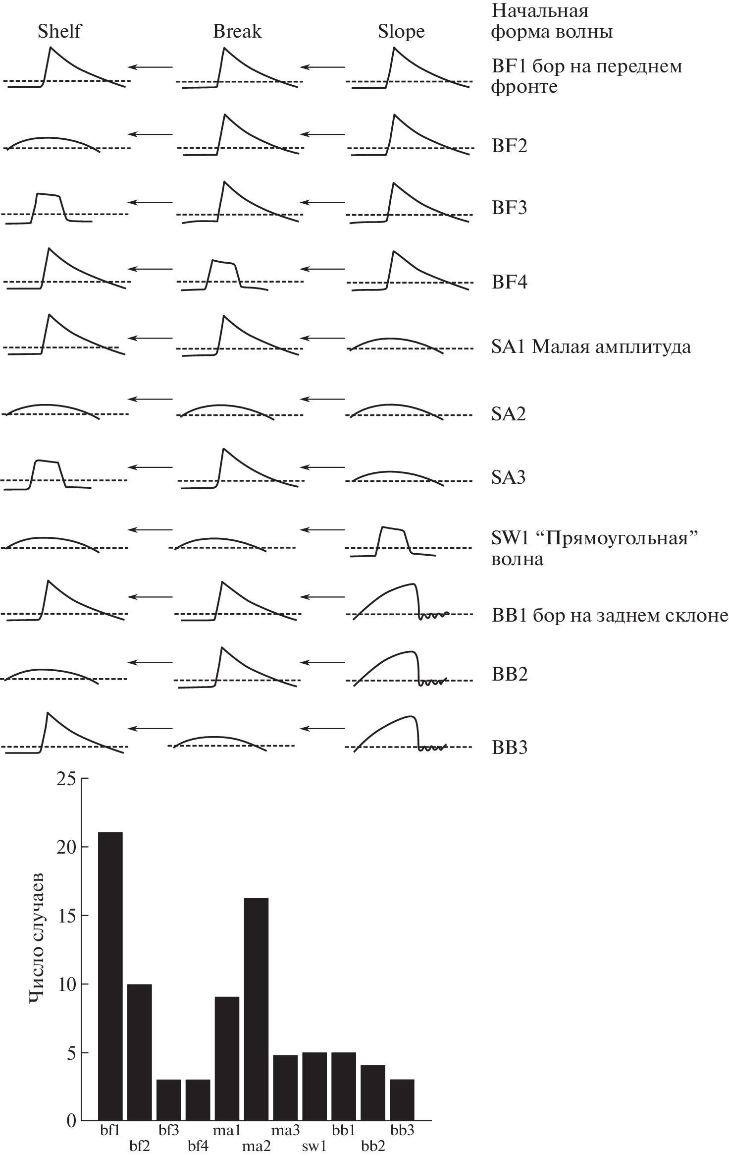 Интенсивные нелинейные внутренние волны на материковой окраине на северо-западном шельфе Австралии обсуждаются с использованием подробных временных рядов скорости и температуры, зарегистрированных на заякоренных измерителях течений и температуры в течение 67 сут. В регионе наблюдается интенсивный полусуточный внутренний прилив, который распространяется к берегу по шельфу. Наблюдаются усиление внутреннего прилива и формирование боро-подобных образований, часто сопровождаемых внутренними уединенными волнами. Представлен частотный спектр внутренних волн, рассчитанный по записям компоненты течений, направленной по нормали к берегу. В данной работе акцент сделан на анализе формы и свойств внутреннего прилива. Выделено пять различных типов волн, которые состоят из боров на передней или задней стороне волны, “прямоугольных” форм волн с бором одновременно на обеих сторонах волны (как на передней, так и на задней), а также линейных волн малой и большой амплитуды. Приведена статистика трансформаций типов внутренних приливов при их распространении по участку трассы от склона до шельфа. Выявлены основные типы волн, проходящие без трансформации, и волны, имеющие относительно короткое время жизни, к которым относятся “прямоугольные” приливные волны и волны с борами на заднем склоне волны. В целом анализ показал реальную картину происходящих нелинейных трансформаций приливных внутренних волн, происходящих на СЗ-шельфе Австралии.