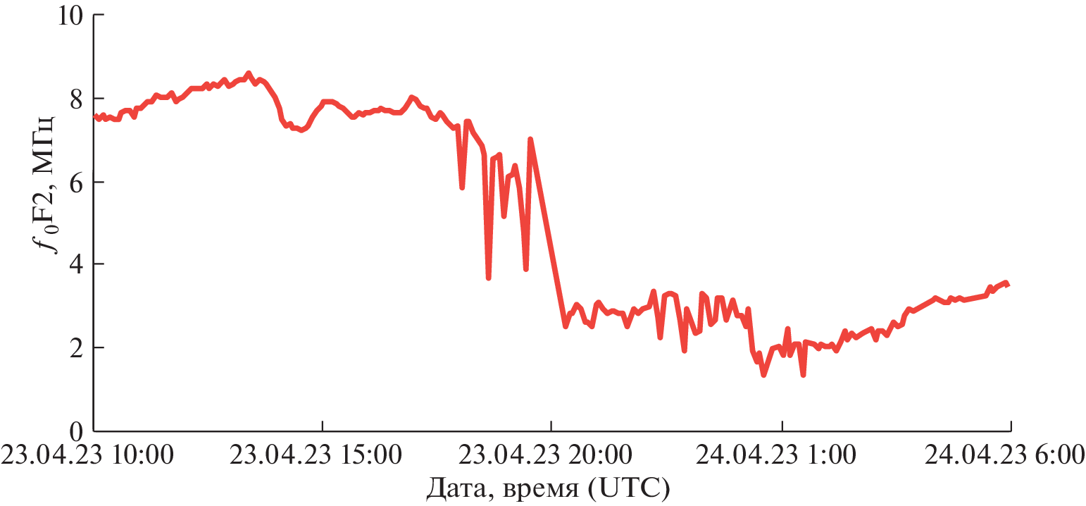 We present the data of instrumental observations made at the Mikhnevo geophysical observatory of the IDG RAS of magnetic field variations and the response of microbaric oscillations and the electric field in the Earth’s surface atmosphere to a strong magnetic storm on April 23, 2023 (Kp = 8). When determining the response of the ionosphere to a magnetic disturbance in the form of a change in the critical frequency of the F2 layer, we use the results of ionospheric sounding performed at the IAP (Leibniz-Institut Fur Atmospharen Physik). It is shown that during periods of maximum magnetic field variations, increased microbaric variations are recorded and increased electric field variations are noted. The magnetic storm was also accompanied by a change in the critical frequency f0F2, as well as in the spectral characteristics of variations in the electric field strength.