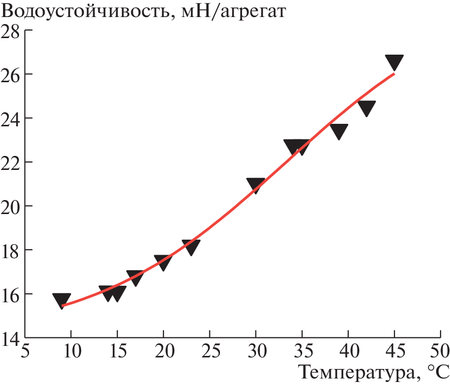 There is an opinion that water stability is provided by hydrophobic bonds between organic soil particles, however, there are works in which the main role in the occurrence of this property is assigned to the presence of hydrophilic organic substances in soils. The aim of the study was to clarify the nature of the bonds (hydrophilic or hydrophobic) that ensure the water stability of soils. The work used samples of sod-podzolic and gray forest soil, as well as leached chernozem. Experiments on the assessment of water stability were carried out by the method of “blades”. It is based on the dissection of linearly arranged aggregates, which were previously moistened in vacuum to values close to saturation. The energy of hydrophobic bonds depends on temperature, so the effect of temperature on the determined value of water stability was studied. Experiments have shown that with an increase in temperature, the water stability of aggregates stored in a wet state from the moment of selection increased, and with a decrease, it fell. This indicates the leading role of hydrophobic bonds in the formation of water stability. For samples dried to an air-dry state, moistened again and kept in a wet state for more than 2 weeks, no temperature dependence of water stability was found. Taking into account that the strength of hydrophobic bonds increases with increasing temperature, and hydrophilic bonds decreases, the data obtained on the immutability of water stability values can be explained if we assume the joint participation of both hydrophobic and hydrophilic bonds in the water stability of soil samples that have passed through the stage of drying to an air-dry state. In fact, these results indicate a strong change in the structural organization of soils during drying.