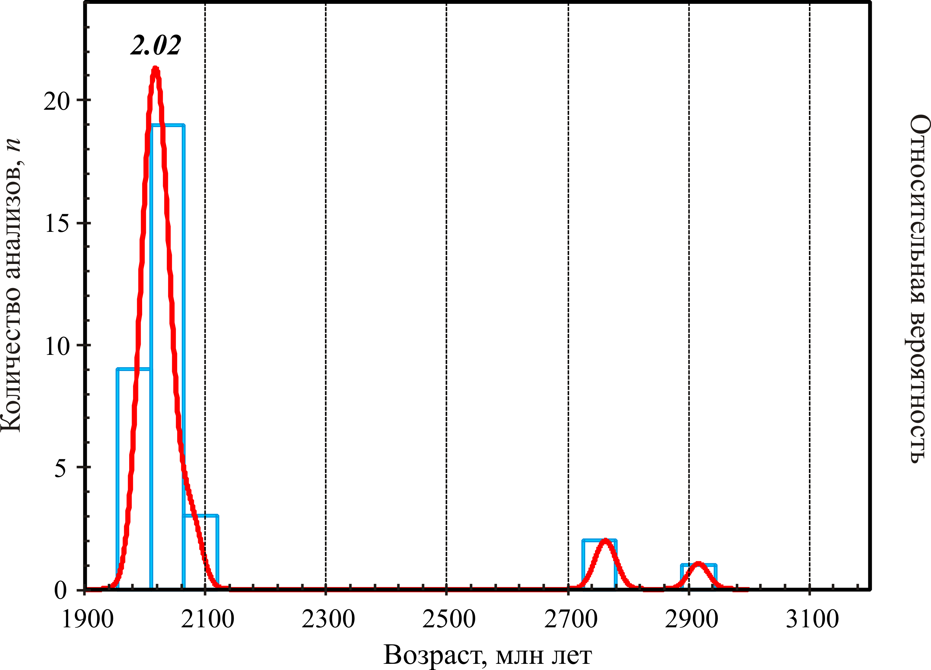 В общей сложности получено 109 оценок возраста циркона, 34 из которых являются конкордантными. Подавляющее число конкордантных оценок возраста находится в интервале 1990– 2047 млн лет с максимумом на кривой относительной вероятности возрастов около 2.02 млрд лет (n = 28) (рис. 3). Средневзвешенное значение возраста по отношению207Pb/206Pb для этих 28 зерен циркона составляет 2018±8 млн лет (2σ, СКВО = 0.50, вероятность = 0.99). Необходимо отметить, что три зерна циркона имеют конкордантые оценки возраста в интервале 2071–2082 млн лет (ESM_1_Table 1.xlsx). Эти оценки возраста перекрываются в пределах погрешности с более молодыми (рис. 3), но имеют статистически значимое средневзвешенное значение возраста по отношению207Pb/206Pb 2076±23 млн лет (2σ, СКВО = 0.077, вероятность = 0.93). Еще два зерна циркона имеют неоархейские возрасты (2758–2770 млн лет), а одно – мезоархейский (2918 млн лет).