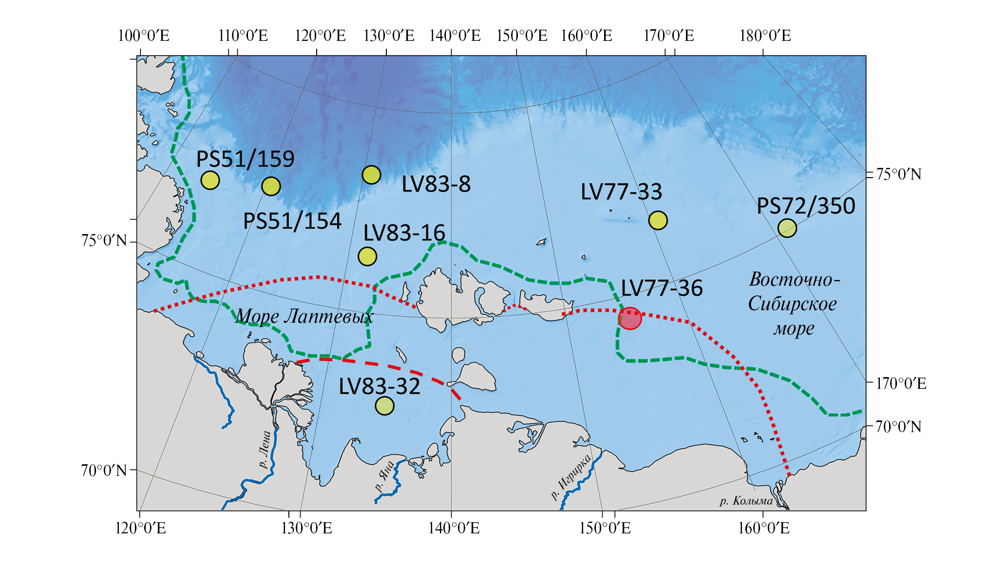 Рис. 1. Местоположение колонки LV77-36 и других колонок, используемых в работе (по [5‒7]). Зеленой штриховой линией показана южная граница дрейфующих льдов; красными штриховой и точечной линиями показаны изолинии солености в июле-сентябре 17 и 23‰ соответственно (по [7]).
