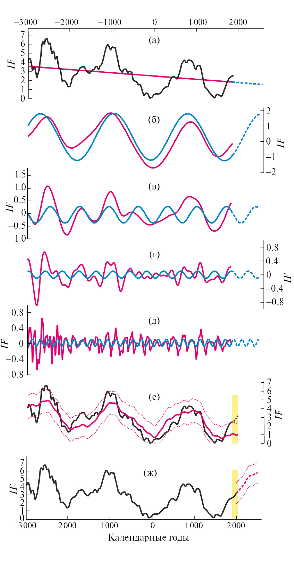 Как видно из рисунков, анализируемые реконструкции были разложены на тренды и совокупность квазипериодических составляющих, сумма которых в точности совпадает с исходными временными рядами, т. е. если экстраполировать выделенные составляющие на некоторый интервал времени с последующим их суммированием, то можно построить эмпирическую прогнозную модель, отображающую сценарий “естественного” развития анализируемых природных процессов в будущем. Однако поскольку выделяемые спектральным анализом составляющие имеют квазипериодический характер, реализация данной процедуры сталкивается с некоторыми неопределенностями и несет элемент субъективизма. Чтобы придать процедуре экстраполяции максимальную строгость и однозначность, для каждой квазипериодичности была подобрана аппроксимирующая ее синусоида (рис. 3 б‒г, 4 б‒д). Оптимизирующими критериями при этом являлись максимизация коэффициента корреляции между квазипериодичностью и синусоидой (оптимизация периодичности) и минимизация величины S = Σ ǀXi – Yiǀ, где Xi и Yi – значения квазипериодичности и синусоиды для i-го года (оптимизация амплитуды).