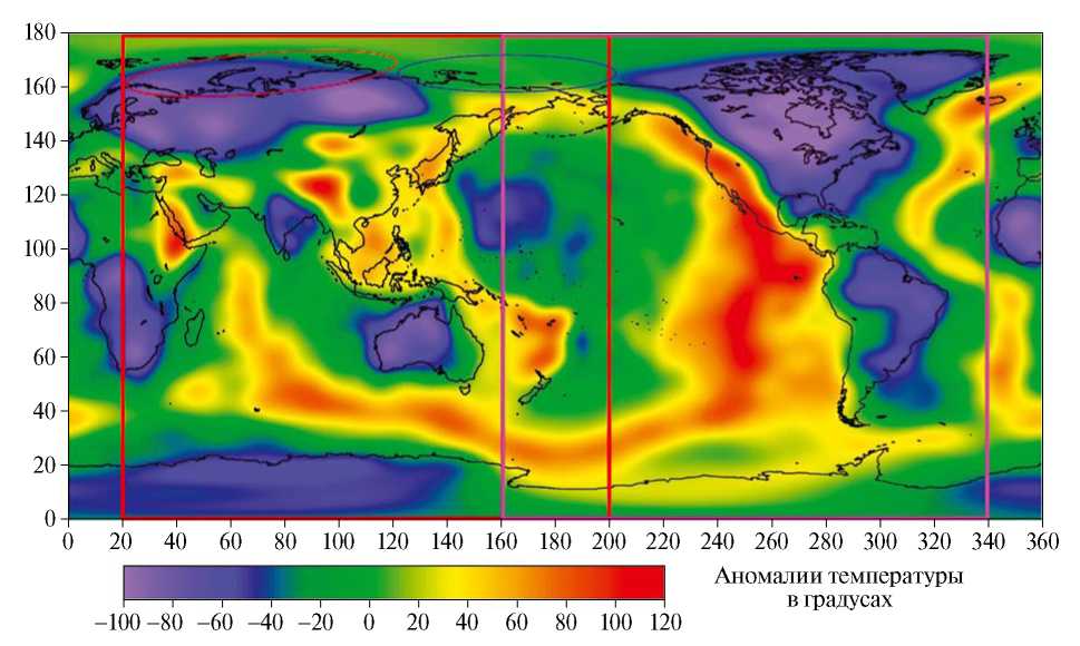 Рис. 1. Распределение аномалий температуры в мантии на глубине 75 км. Черной линией показаны контуры континентов. Красные линии – сечения Земли по 20 и 200 градусу восточной широты. Розовые линии – сечения Земли по 160 и 340 градусу восточной долготы.