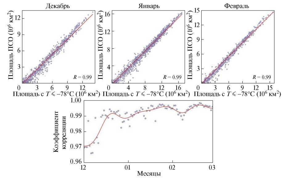 Динамический барьер препятствует проникновению теплых воздушных масс внутрь вихря и тем самым косвенно способствует понижению температуры внутри полярного вихря в нижней стратосфере, формированию частиц ПСО и накоплению на них газовых “резервуаров” хлора, которые адсорбируются на поверхности ПСО при низких температурах. Как известно, ПСО формируются при температуре –78°C и ниже [5]. В качестве подтверждения ослабления динамического барьера в настоящей работе приводится динамика полей температуры на уровне 50 гПа или площади ПСО на уровне 460 К. Для определения правомерности такой взаимозамены на рис. 1 приведена внутрисезонная изменчивость минимальной температуры, площади с температурой T ≤ –78°C на уровнях 30, 50 и 70 гПа и площади ПСО на уровне 460 K, а на рис. 2 показана полученная зависимость площади ПСО на уровне 460 K от площади с T ≤ –78°C на уровне 50 гПа. Минимумы в сезонном ходе минимальной температуры совпадают с максимумами площади с T ≤ –78°C на соответствующих уровнях: 30 гПа ~ 1 января, 50 гПа ~ 15 января и 70 гПа ~ 25 января. При этом сезонный ход, дата максимума (15 января) и диапазон изменений площади ПСО на уровне 460 K хорошо согласуются с соответствующими характеристиками площади с T ≤ –78°C на уровне 50 гПа (рис. 1). Коэффициент корреляции между среднесуточными значениями площади ПСО и площади с T ≤ –78°C составляет 0.99 в декабре, январе и феврале, при этом в период с 1 декабря по 1 марта коэффициент корреляции меняется в диапазоне 0.958–0.998 (рис. 2). Таким образом, можно считать, что при рассмотрении ослабления динамического барьера характеристики площадь ПСО (на 460 K) и площадь с T ≤ –78°C (на 50 гПа) практически равносильны.