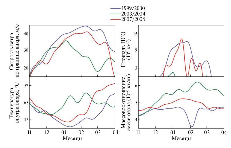 Рис. 4. Временной ход средней скорости ветра по границе вихря, средней температуры внутри вихря, среднего массового отношения смеси озона внутри вихря на уровне 50 гПа и площади ПСО на уровне 460 K над Арктикой с ноября по март 1999/2000, 2003/2004 и 2007/2008 гг.