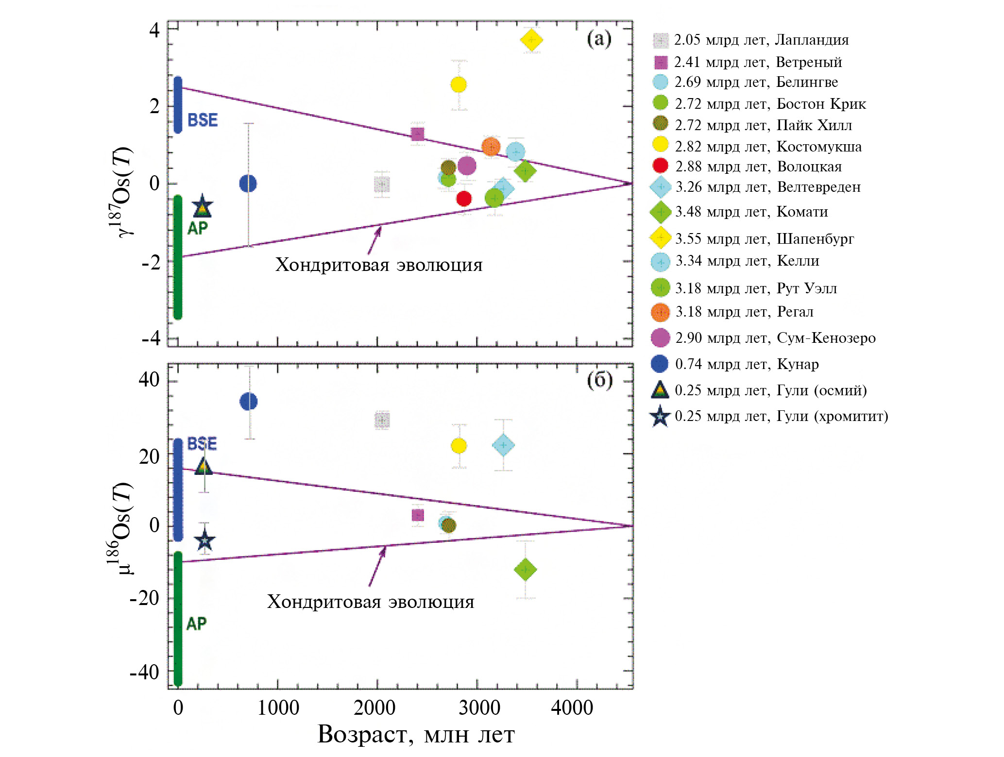 Рис. 2. Диаграмма вариаций (а) начальных 187Os/188Os-изотопных составов, выраженных в величинах γ187Os(T), и (б) начальных 186Os/188Os-изотопных составов, выраженных в величинах 186Os(T), для хромитита, минералов осмия Гулинского массива, МПГ Кунарского комплекса и докембрийских комаиитовых массивов, относительно их возраста. Данные по коматиитам по [9], по МПГ Кунарского комплекса по [8]. Синяя вертикальная полоса для современной Валовой Силикатной Земли (Bulk Silicate Earth: BSE) по [4] для (а) и по [7] для (б). Os-изотопные данные для абиссальных перидотитов (Abyssal Peridotite: AP) взяты из [3, 7], для хондритовых метеоритов – из [6, 19, 20]; последние представлены в виде сегмента, заключенного между двумя фиолетовыми сходящимися наклонными линиями и отвечают их полному диапазону вариаций современных значений величин γ187Os, спроецированных во времени к первичному отношению 187Os/188Os для Солнечной системы. Все погрешности отвечают 2SD от среднего значения.