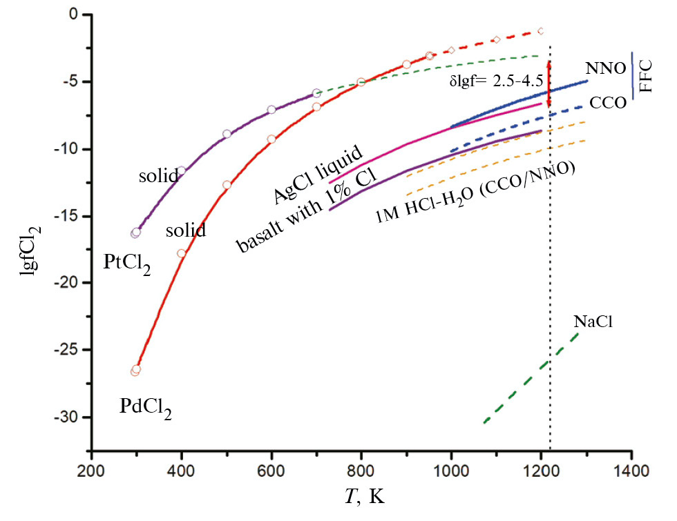 Теоретически можно перевести платину в хлорид и при низкой fO2 за счет достаточно высокой летучести хлора. В этом случае при наличии СО формируется смешанный карбонильно-хлоридный комплекс платины с повышенной летучестью (PtCl2(CO)2). Высокую летучесть этого соединения предложено использовать для травления пленок платины газом с мольным отношением CO/Cl2 = 2/1 [7]. В работе [8] рассчитали состав маловодного (содержании воды не более 10 мол. %) флюида в системе C–O–H–Cl и предсказали высокую долю (примерно 1/2) Cl2 и COCl2 от общего содержания хлора, принятую равной 5 мол. %. При общем давлении, принятом при расчетах равном 300 МПа, такое содержание отвечает фугитивности хлора больше 10 бар.