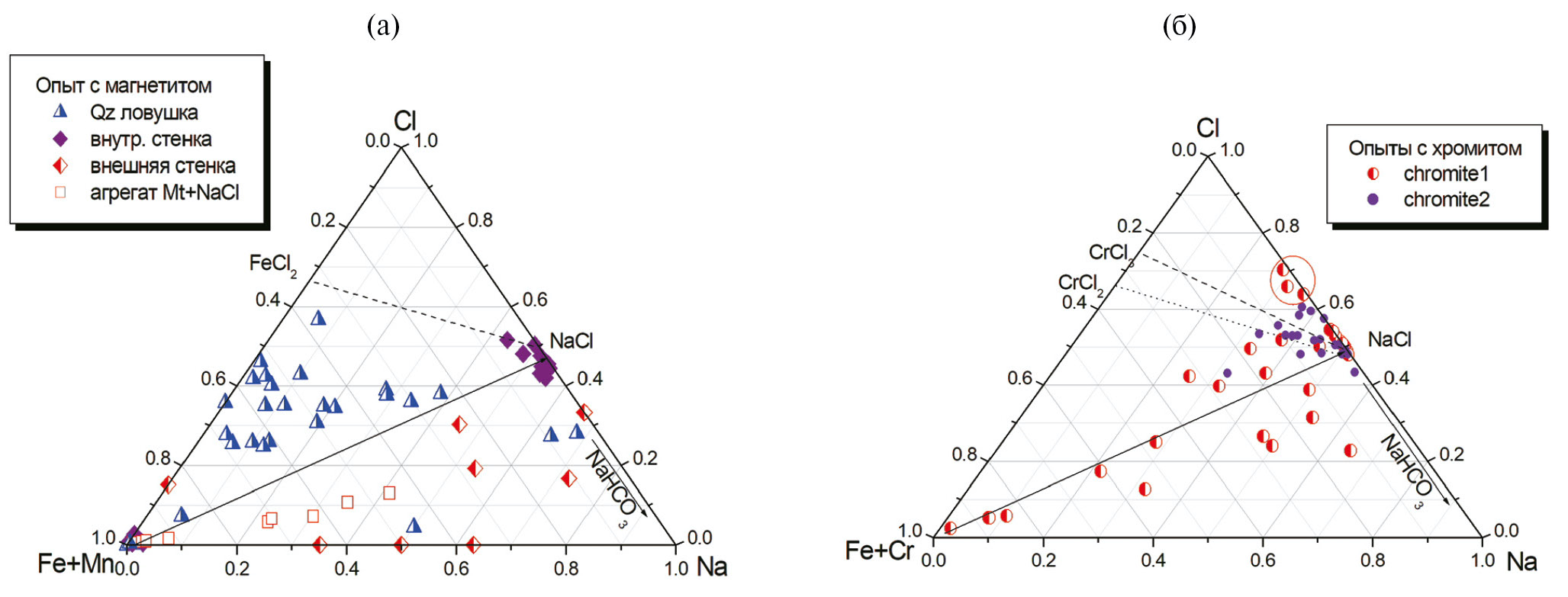 Рис. 3. Микрозондовые анализы (атомные доли) агрегатов мелкодисперсных фаз, продуктов реакций генерации хлорсодержащего флюида; а) опыт О75 система с железом: на стенках внутренней ампулы, внешней ампулы, кварцевой ловушке и магнетите, б) двух опытов с хромитом: первый опыт с 10% NaCl, второй с 1% NaCl. Точки составов внутри треугольников Fe(Cr)–NaCl–Na отражают наличие натриевых безхлорных фаз (Na2CO3, NaHCO3 и др.). На рис. 3 б можно отметить, что ряд составов выходит за пределы треугольника (Fe+Cr)–CrCl3–NaCl, что отражает наличие хлоридов, отличных от хлоридов натрия и хрома (+ железа), предположительно это хлориды магния.