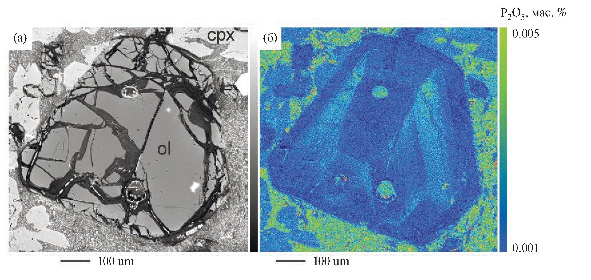 Рис. 2. Микрофотография оливина из образца оливинового кумулата 12103: а) изображение в отражённых электронах, б) карта распределения Р демонстрирует характерную для оливина магматическую зональность. Ol – оливин, cpx – клинопироксен.