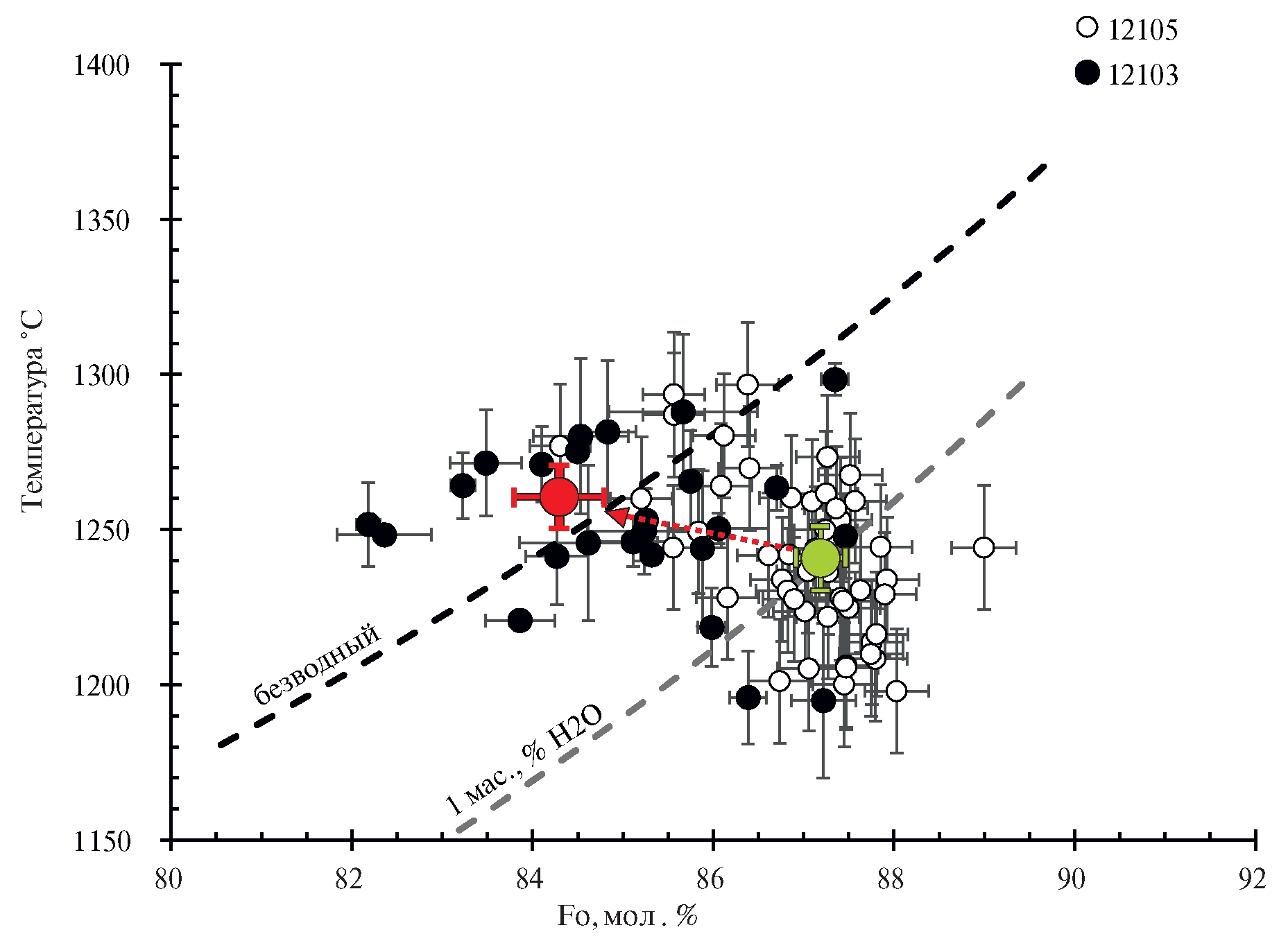 Рис. 4. Температуры кристаллизации коматиитовых базальтов Ветреного пояса, полученные с помощью Al-термометрии в оливине [12]. Данные для образца 12105 из [11]. Пунктирными линиями показаны линии кристаллизации расплава коматиитовых базальтов без водного флюида и исходного расплава, содержавшего 1 мас. % H2O. Крупными значками показаны средние температуры кристаллизации для образцов 12105 и 12103 (для Fo <86 мол. %). Стрелка отражает повышение температуры в расплаве.