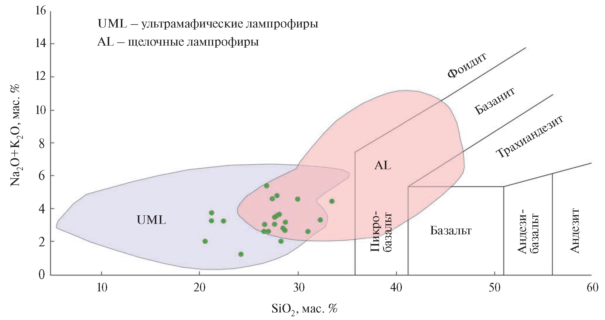 Рис. 4. Составы айлликитов Курского блока Сарматии на диаграмме SiO2–(K2O+Na2O) с полями ультрамафических и щелочных лампрофиров [14].