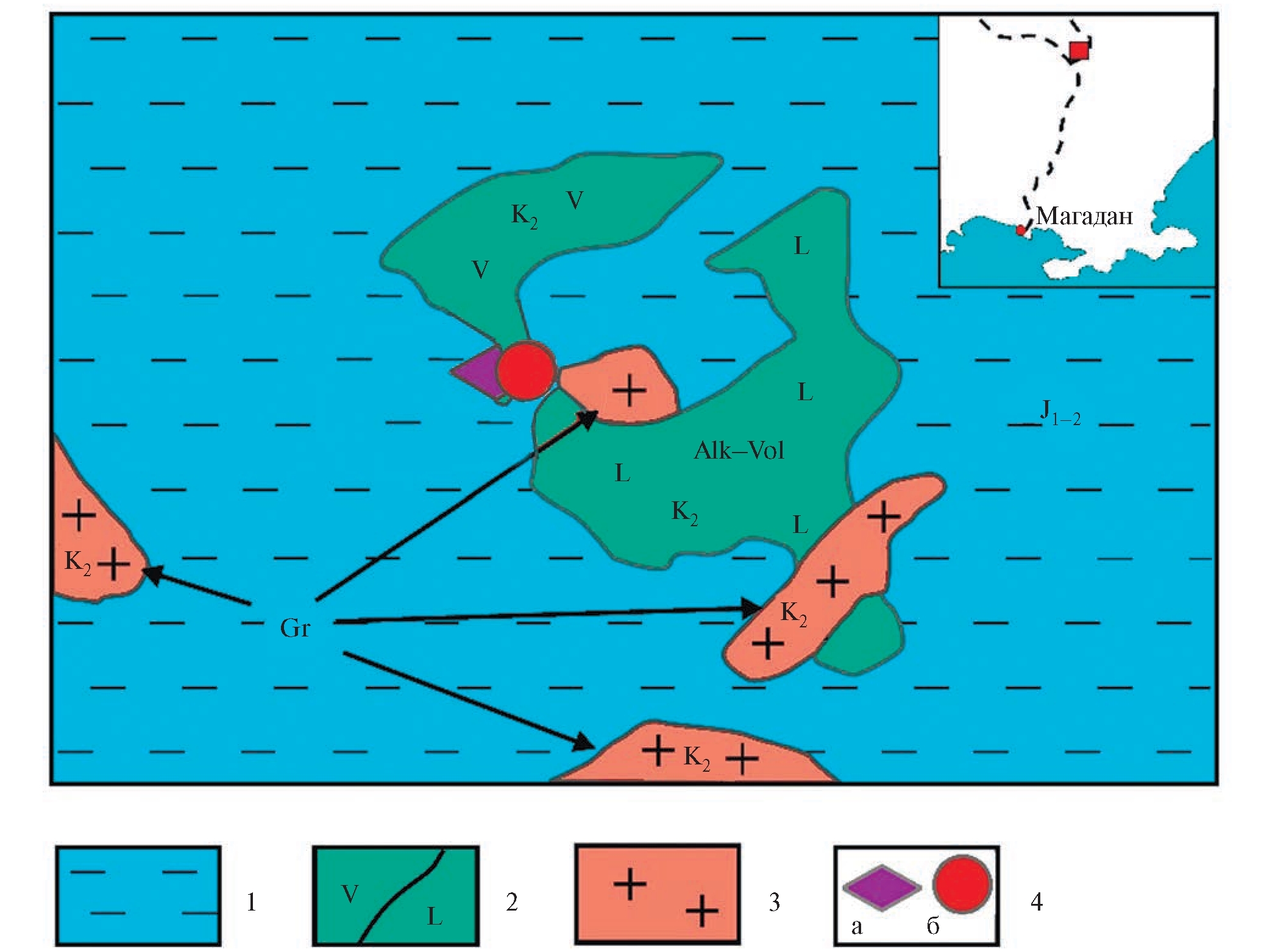 1 – раннесреднеюрские черносланцевые толщи (J1-2); 2 – позднемеловые щелочные вулканиты (K2); 3 – позднемеловые граниты (Gr); 4 – Печальнинское рудопроявление: а – редкометальная и REE-минерализация; б – эпитермальная Au–Ag-минерализация.