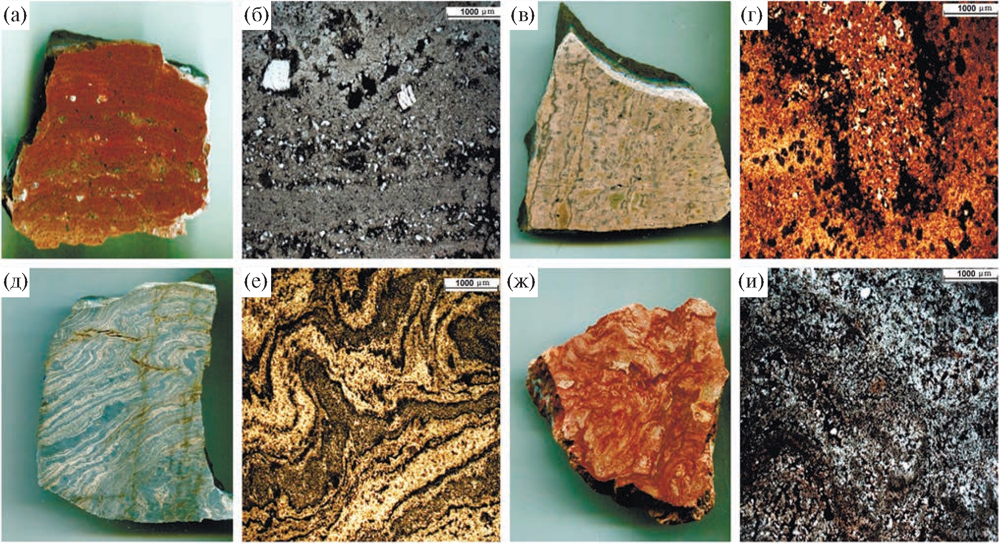 Рис. 2. Текстуры минерализованных REE трахириолитов Печальнинского рудного поля. Фотографии изученных образцов (а–и): а – флюидальной трахириолит (образец д – 22), б – фотография шлифа (д – 22), в - флюидальной трахириолит (образец 933), г – фотография шлифа (933), тонкослоистый трахириолит (образец 994-А89), д – фотография шлифа (994-А89), ж – флюидальной трахириолит (образец РЕ-15-2), и – фотография шлифа (РЕ-15-2).