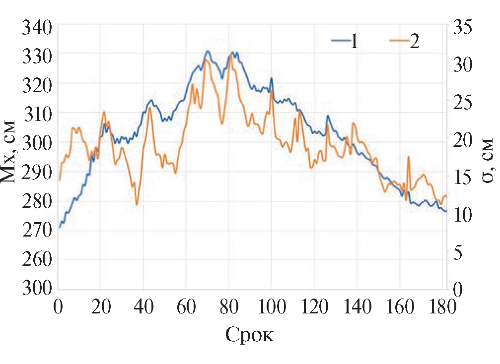 Для оценки эффективности прогностических методик необходимо рассчитать статистические параметры случайного процесса по 182 сечениям, которые соответствуют 91 дню и соответственно 182 срокам наблюдения и 11 реализациям, которые соответствуют анализируемым годам. Математическое ожидание и стандартное отклонение случайного процесса есть неслучайные функции, значения которых были рассчитаны отдельно по каждому из сечений (рис. 1).