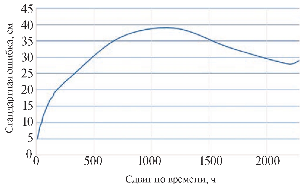 Говоря о краткосрочном прогнозировании, мы можем иметь в виду прогнозирование уровней воды на один или несколько шагов вперёд с фиксированной заблаговременностью прогноза (в данном случае решается задача прогнозирования случайного процесса, представляемого в виде временного ряда), либо прогнозирование высших или экстремальных уровней воды, которые представляют собой случайную величину. В первом случае одним из наиболее строгих критериев (при условии относительно малой изменчивости уровня воды) является так называемый “природный” прогноз. Стандартная ошибка подобного прогноза растёт с увеличением заблаговременности, достигая в пике 39 см, в виду наличия межгодовой связанности данных, после пика ошибка начинает убывать, достигая минимума при сдвиге, кратному сезонности (рис. 2).