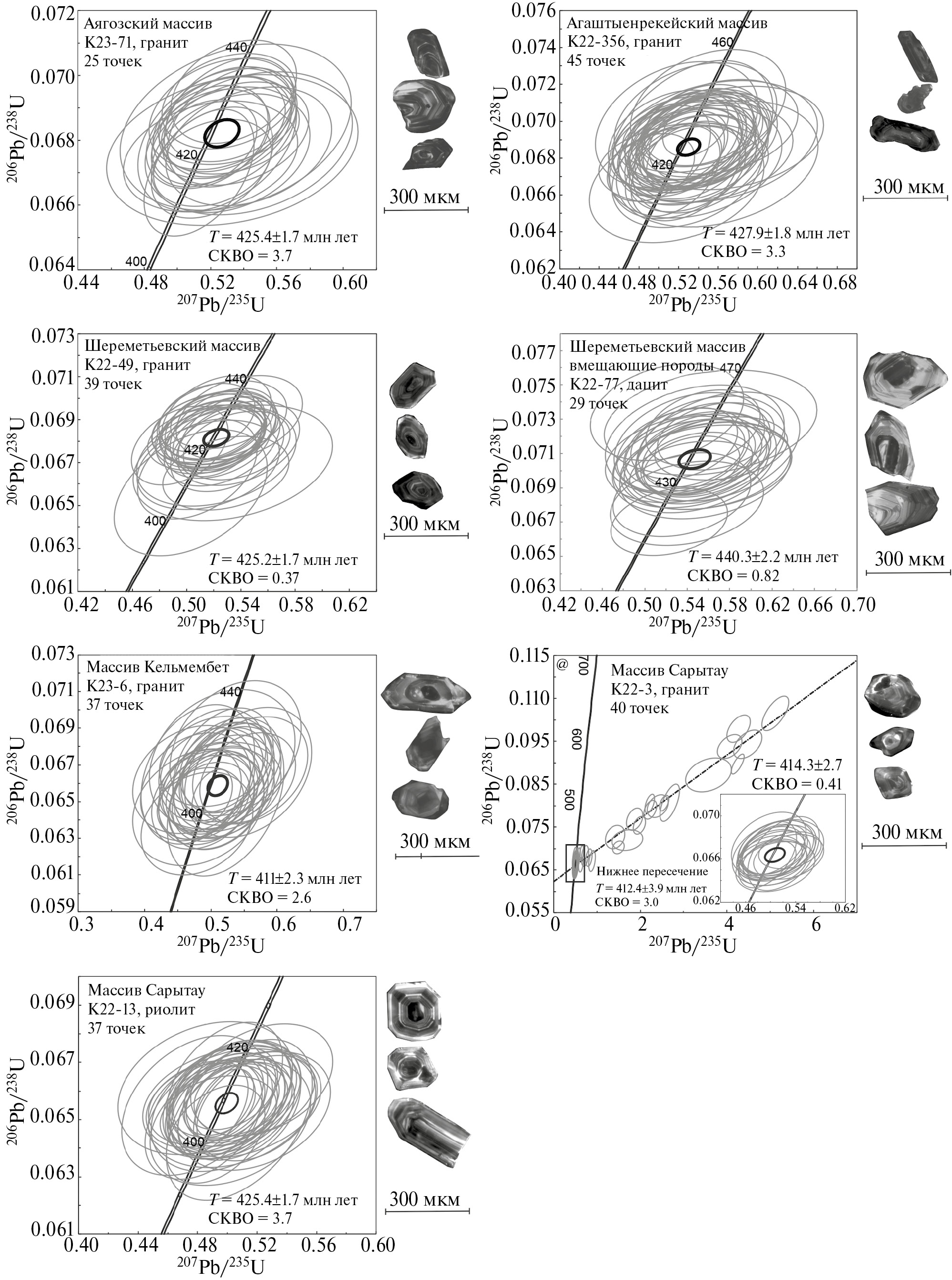 Рис. 2. Диаграммы с конкордией для пород северо-восточной части Чингиз-Тарбагатайского сегмента и микрофотографии представительных зёрен циркона, выполненные в режиме катодолюминесценции.
