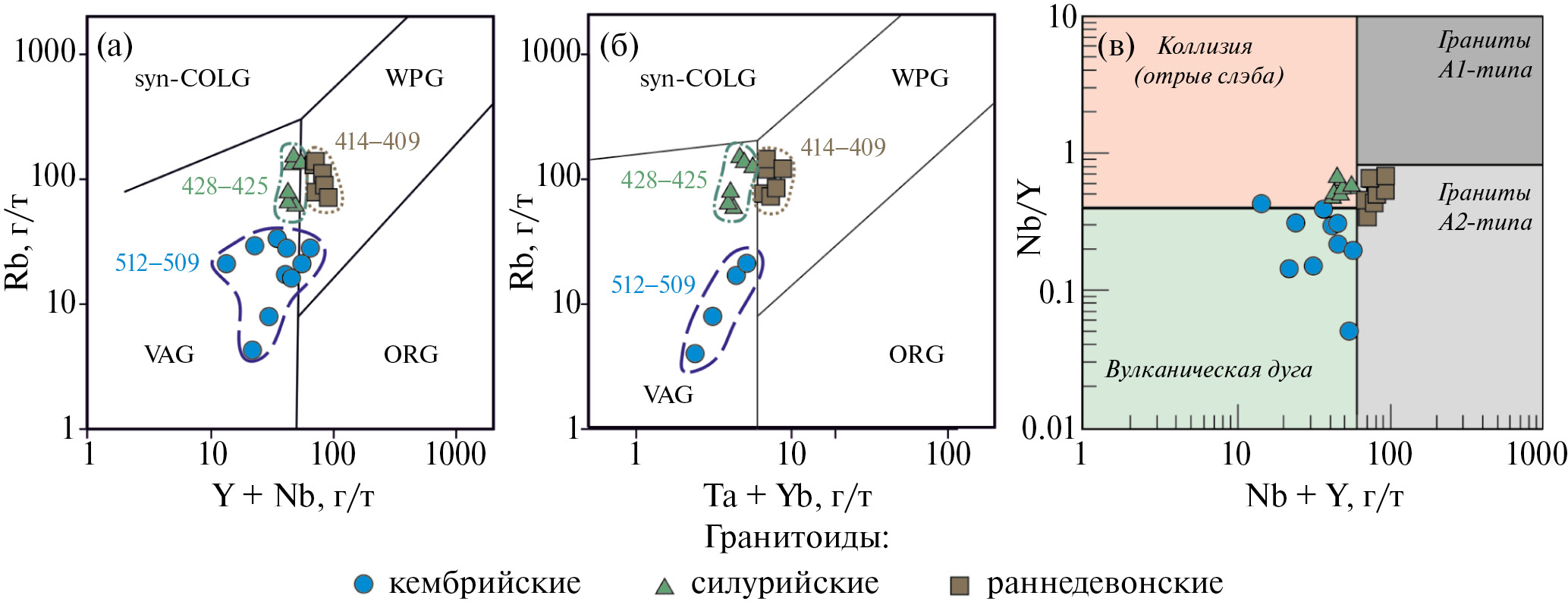 Положение полей составов кембрийских, силурийских и раннедевонских пород на диаграммах для реконструкции геодинамических условий формирования гранитоидов [17, 19], а также особенности химического состава позволяют проследить эволюцию источников для данного участка земной коры (рис. 4). Кембрийские породы локализуются в поле гранитоидов энсиматических островных дуг. Силурийские гранитоиды за счёт более высоких содержаний крупноионных литофильных компонентов (Rb) попадают в поле пород энисалических субдукционных зон или магматитов аккреционно-коллизионных событий. Раннедевонские гранитоиды имеют более высокие содержания высокозарядных элементов (Ta, Nb, Yb), что приводит к их локализации в поле внутриплитных пород. Подобные изменения состава гранитоидов Чингиз-Тарбагатайского сегмента во времени являются отражением эволюции земной коры складчатой области от раннепалеозойской энсиматической дуги к вулканическому поясу с достаточно зрелой земной корой в среднем палеозое.