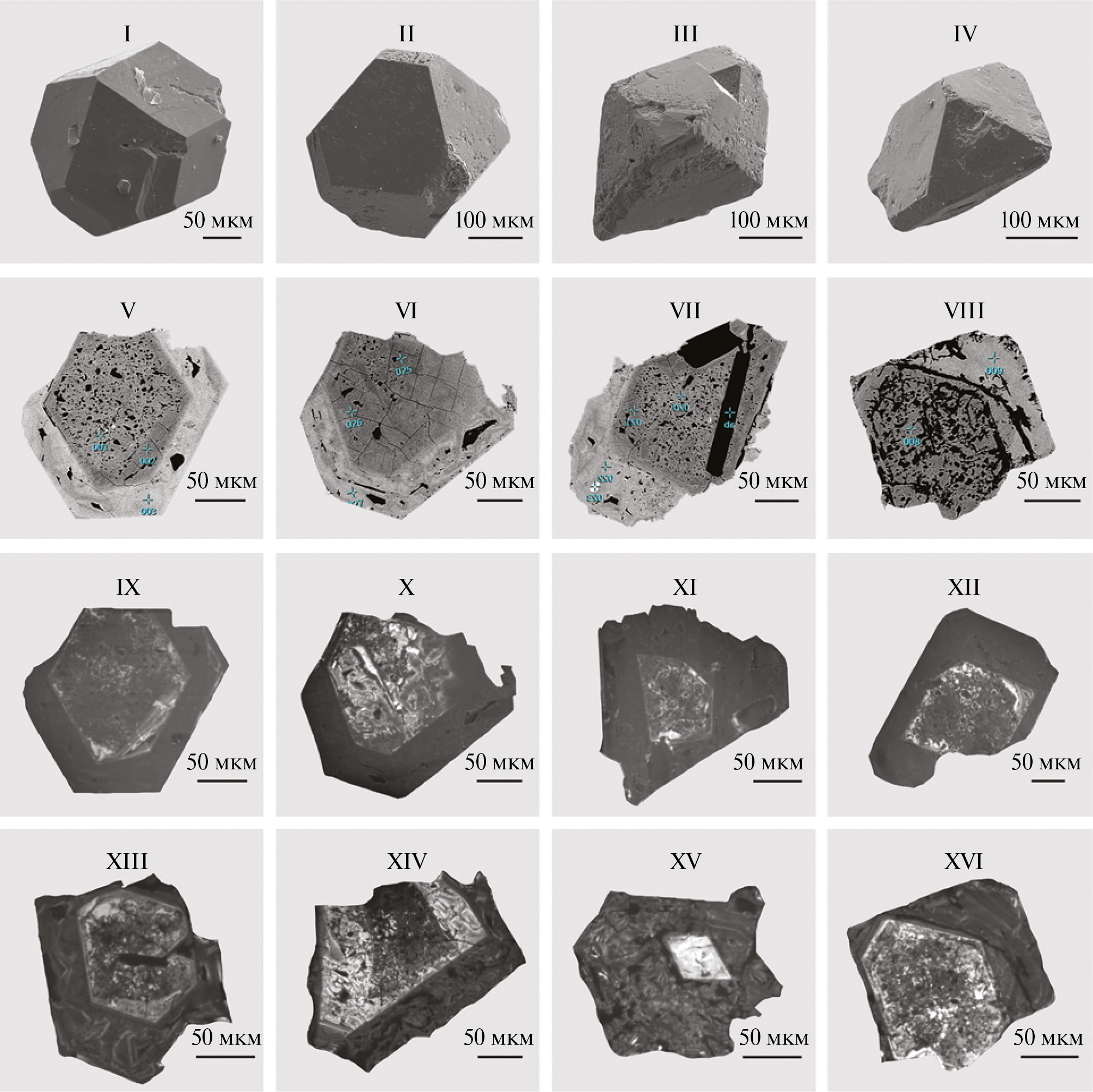 Рис. 4. Микрофотографии кристаллов циркона из альбитита (проба ЗШХ-57/22), выполненные в режимах вторичных электронов (I–IV, XIII–XVI), обратноотражённых электронов (V–VIII) и катодолюминесценции (IX–XII). XIII–XVI — кристаллы циркона кристаллов футляровидной формы после отжига при 850°C и кислотной обработки при 220°C в течение 4 ч.