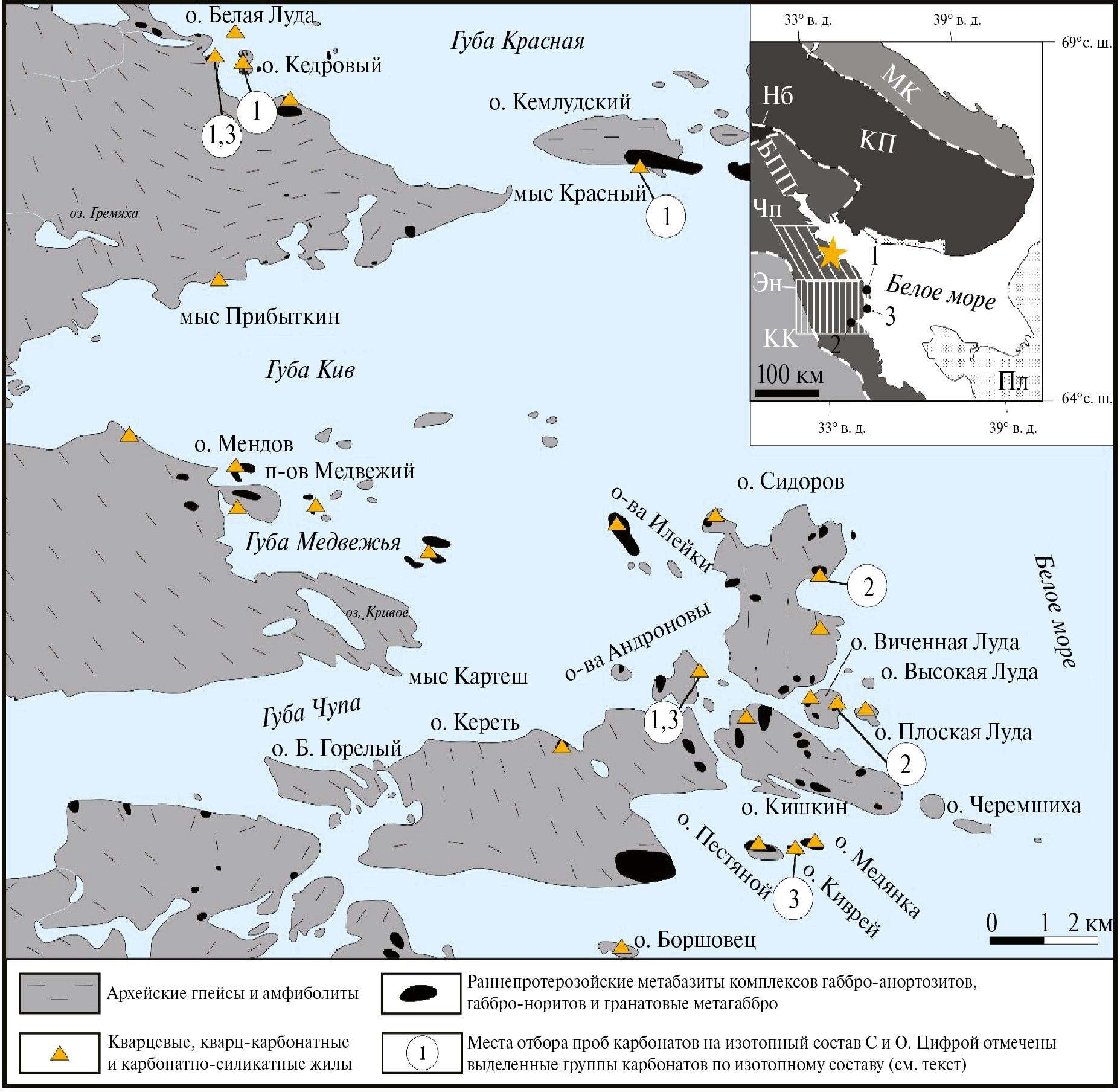 На побережье Белого моря Северной Карелии и прилегающих островах в пределах Чупинского сектора Беломорского подвижного пояса (БПП) Балтийского щита распространены выходы архейских гнейсов и амфиболитов, среди которых залегают тела раннепротерозойских метабазитов (рис. 1) [4, 7].