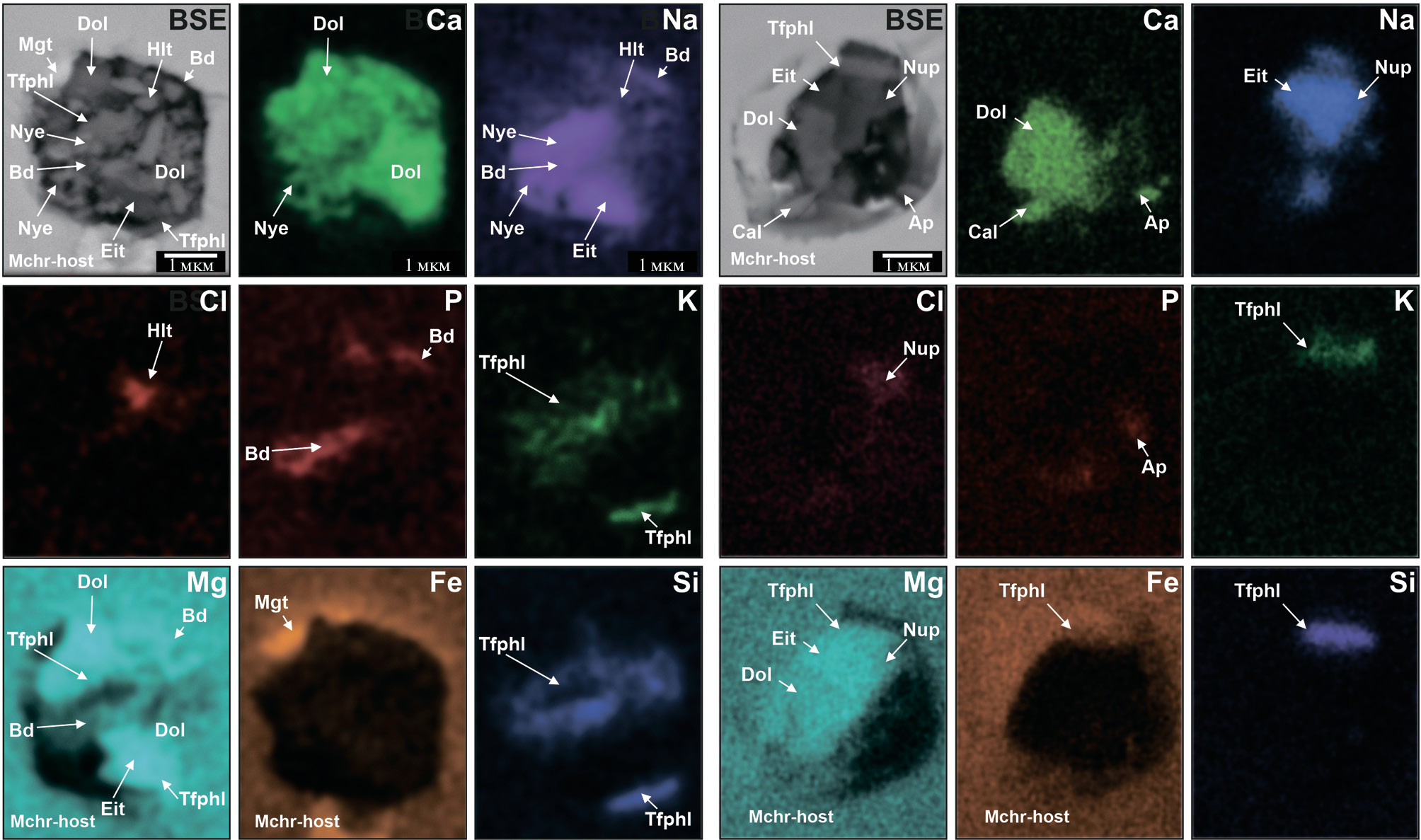 Рис. 4. BSE-изображения и элементые карты индивидуальных вторичных расплавных включениях в магензиохромите. Символы дочерних минералов приведены в таблице 2.