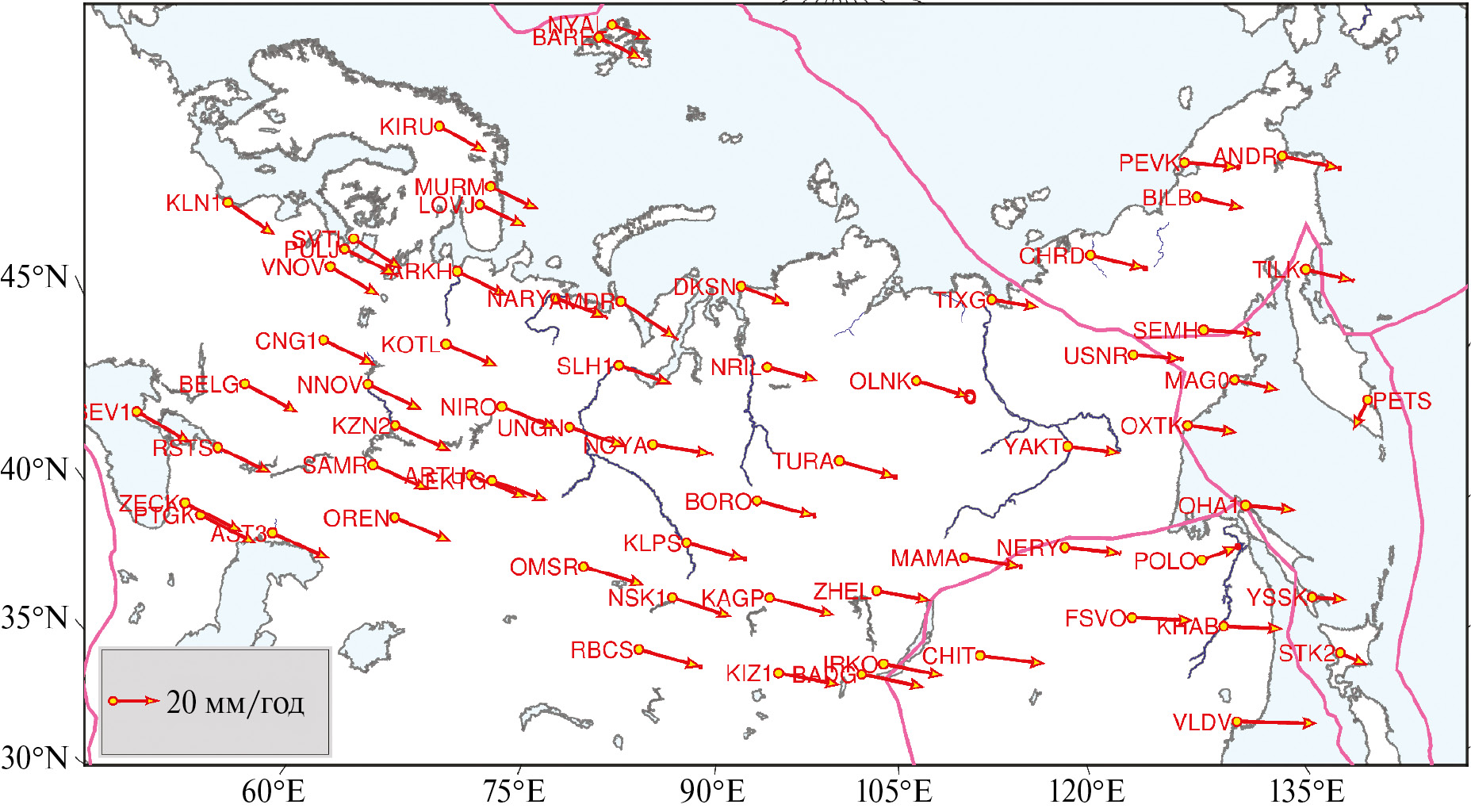 К настоящему времени, часть наблюдательных пунктов, находящихся на территории Российской Федерации, проработала достаточно продолжительное время, чтобы определять по ним скорости смещений земной поверхности с приемлемой точностью и анализировать пространственные вариации этих движений.