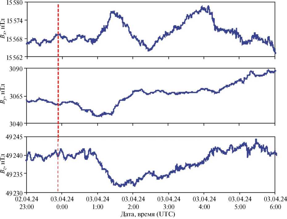 Рис. 1. Вариации компонент магнитного поля 02–03.04.2024 г. по данным MHV (пунктиром обозначено время события 1 из табл. 1)