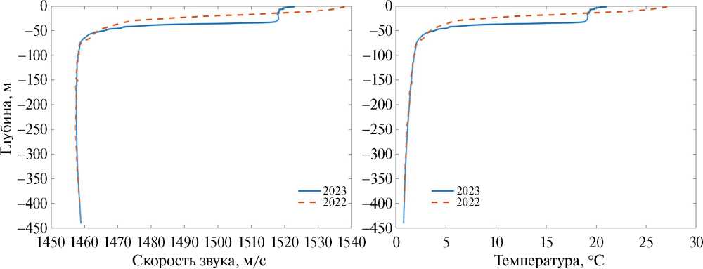Рис. 3. Измеренные CTD-зондом вертикальное распределение скорости звука (а) и температуры (б) по глубине в 2022 и 2023 годах
