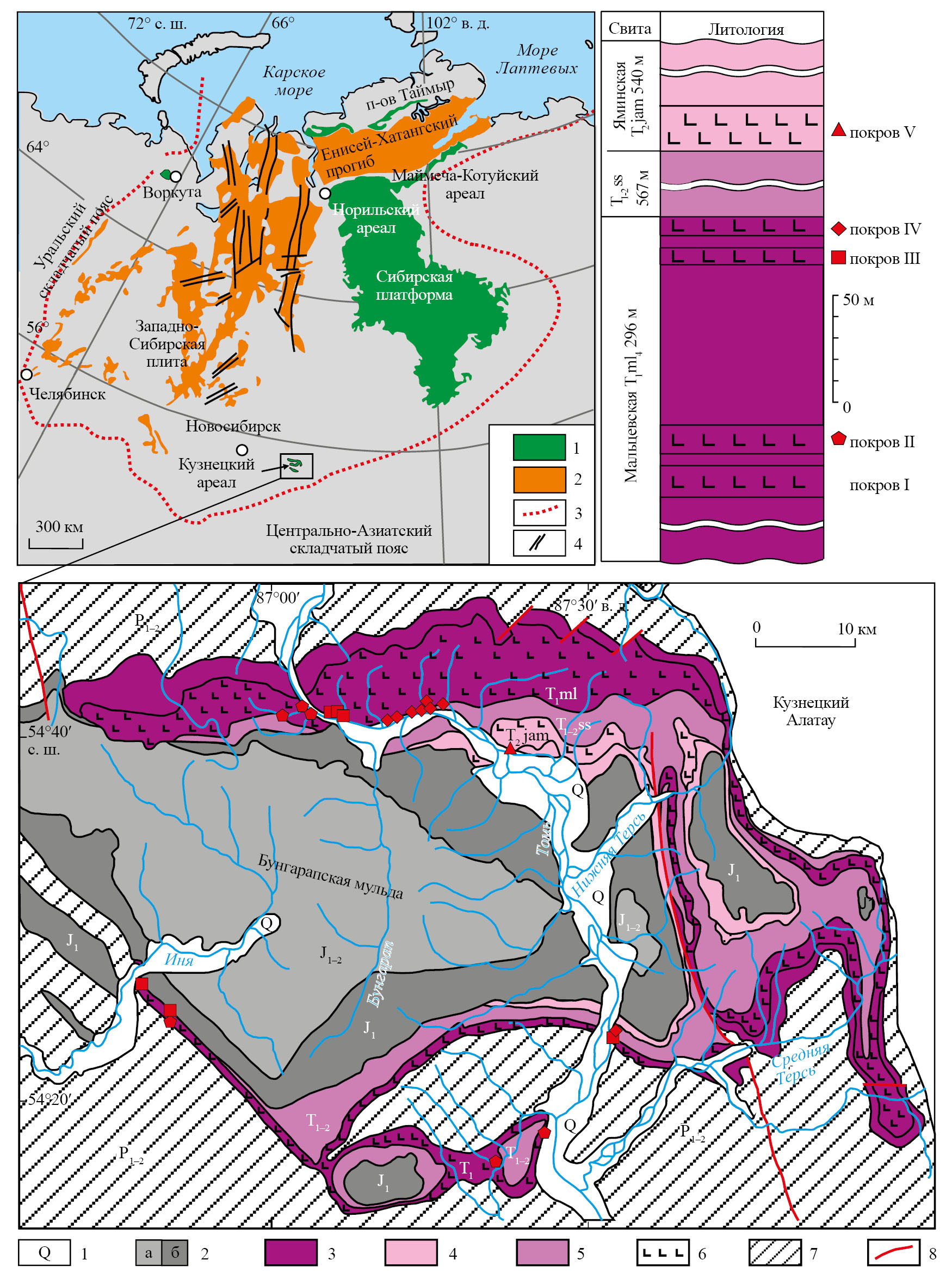 Рис. 1. Географическое положение и геологическое строение Кузнецкого ареала Сибирской крупной магматической провинции, по [8] с упрощениями. Условные обозначения к принципиальной схеме Сибирской крупной магматической провинции: 1 – траппы обнажённые; 2 – траппы погребенные; 3 – граница магматической провинции; 4 – крупные грабен-рифтовые структуры. Условные обозначение к схеме геологического строения Кузнецкого ареала и разрезу траппового комплекса: 1 – четвертичные аллювиальные отложения; 2 – угленосная моласса нижнеюрская (а) и среднеюрская (б); 3–5 – стратиграфические подразделения осадочно-вулканогенного траппового разреза нижнего триаса: 3 – мальцевская свита; 4 – сосновская свита; 5 – яминская свита; 6 – покровы базальтов и андезибазальтов в разрезе траппового комплекса; 7 – нижне-среднепермская угленосная моласса; 8 – разломы. Условные обозначения точек опробования на схеме и разрезе соответствуют рис. 3.