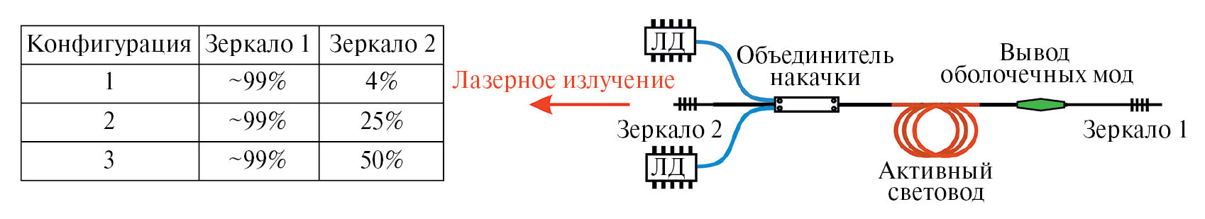Рис. 2. Схема висмутового лазера с накачкой в оболочку в разных конфигурациях.