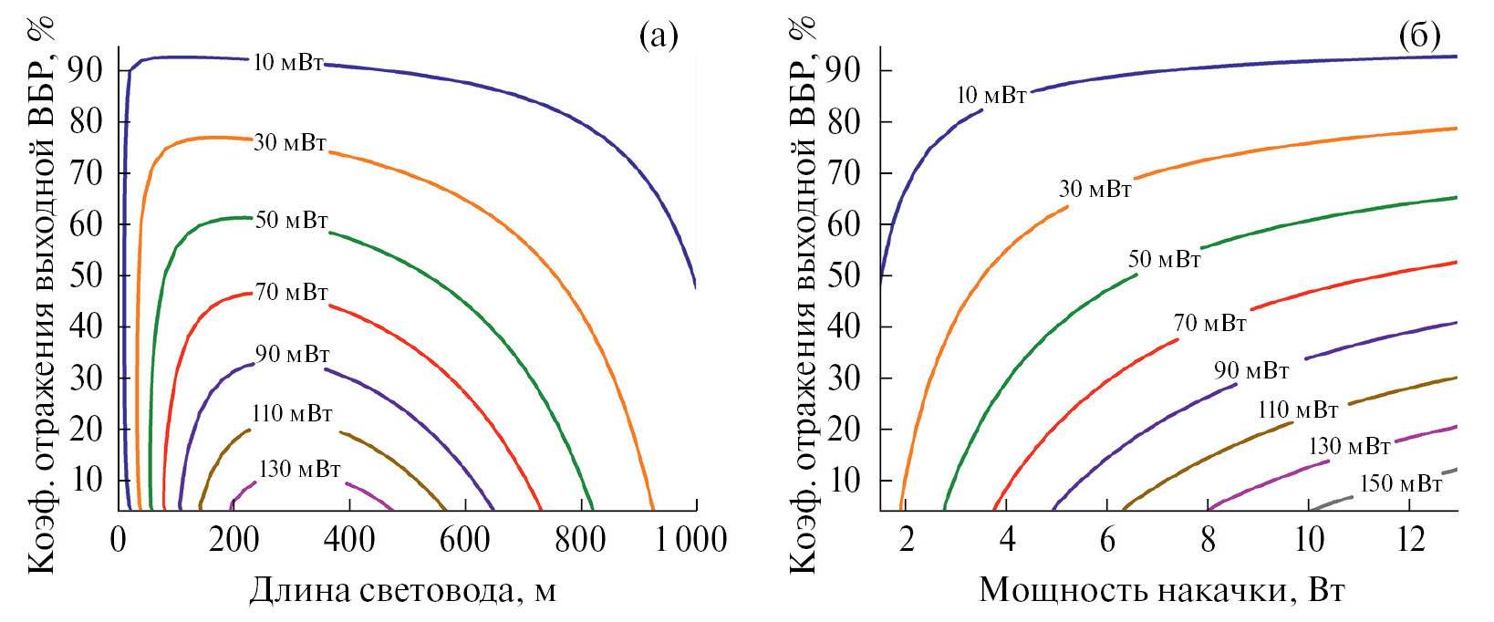 Результаты расчетов, показанные на рис. 3а, б, достаточно хорошо согласуются с полученными экспериментальными данными. В частности, результаты расчетов подтверждают, что оптимальная длина активного световода в таких лазерах составляет от 200 до 500 м, а выходная мощность может достигать 130–150 мВт для лазеров с 4%-ным отражением выходного зеркала. Таким образом, результаты численных расчетов показывают, что полученные конфигурации лазеров являются вполне оптимальными с точки зрения получения максимально достижимых параметров, а дальнейший прогресс по масштабированию выходной мощности таких систем, прежде всего, должен быть связан с оптимизацией дизайна и химического состава стекла световода.
