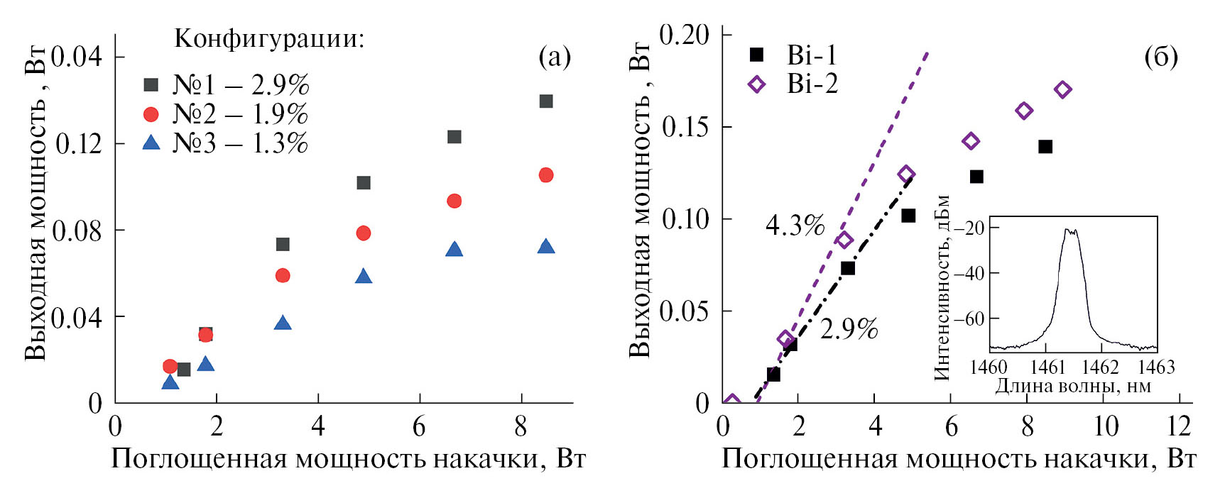 На рис. 4а изображены экспериментально полученные зависимости выходной мощности лазеров различных конфигураций на основе образца Bi-1 от поглощенной мощности накачки. Длина активного световода около 200 м. Видно, что реализованные конфигурации лазеров обладали сравнимыми пороговыми значениями мощности накачки для получения лазерной генерации. На начальном участке полученные зависимости были близки к линейным, тогда как при дальнейшем увеличении мощности накачки происходило насыщение мощности на выходе лазера. Данный эффект заметнее всего наблюдался для резонатора с высоким коэффициентом отражения выходного зеркала (конфигурация № 3). Причиной наблюдаемого явления, как уже было показано в работе [17], была относительно медленная спонтанная релаксация ВАЦ-Si с уровня E3 на уровень E2, становясь “bottleneck” при относительно высоких значениях мощности накачки. Для общего анализа работы лазерной системы проводилась оценка дифференциальной эффективности рассматриваемых конфигураций. Используя начальный (линейный) участок полученных зависимостей, было определено, что эффективность созданных висмутовых лазеров может достигать от 1 до ~3% для разных конфигураций. Максимальное значение эффективности устройства достигалось для лазеров с наиболее прозрачным выходным зеркалом. В таком случае выходная мощность лазера могла достигать почти 140 мВт.