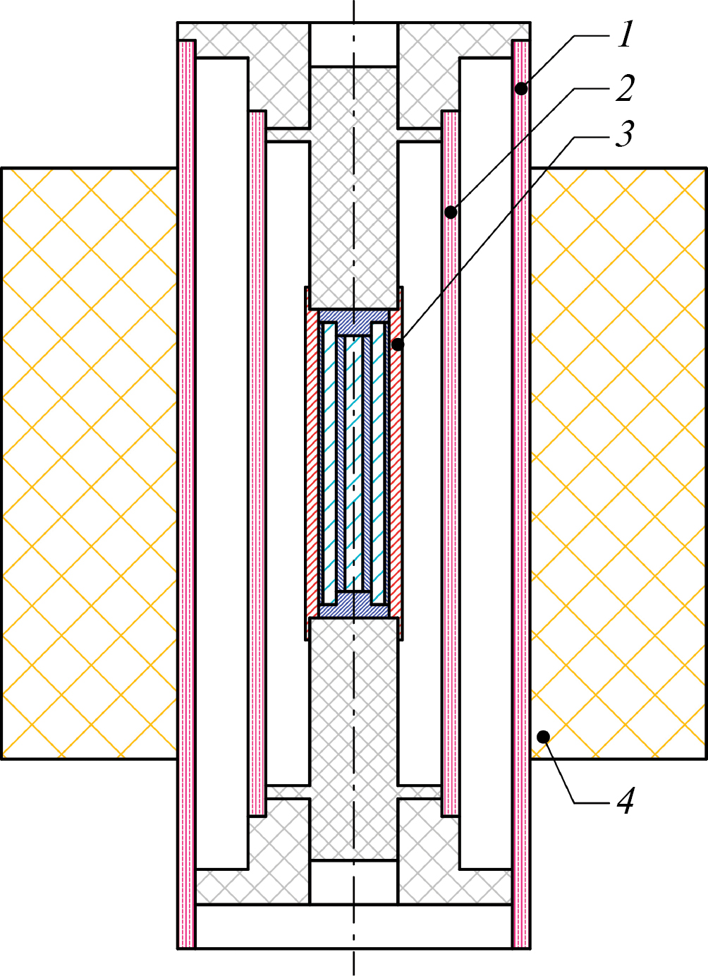 Камера сжатия (рис. 2) образована толстостенной медной обжимающей трубкой и массивными торцевыми заглушками (габаритные размеры камеры сжатия: длина – 150 мм, диаметр – 21.8 мм). Под обжимающей трубкой коаксиально располагаются датчики давления (эталоны) и исследуемый образец, отделенные от обжимающей трубки тонкой (~0.15 мм) контрастирующей оболочкой, изготовленной на основе сплава вольфрама.